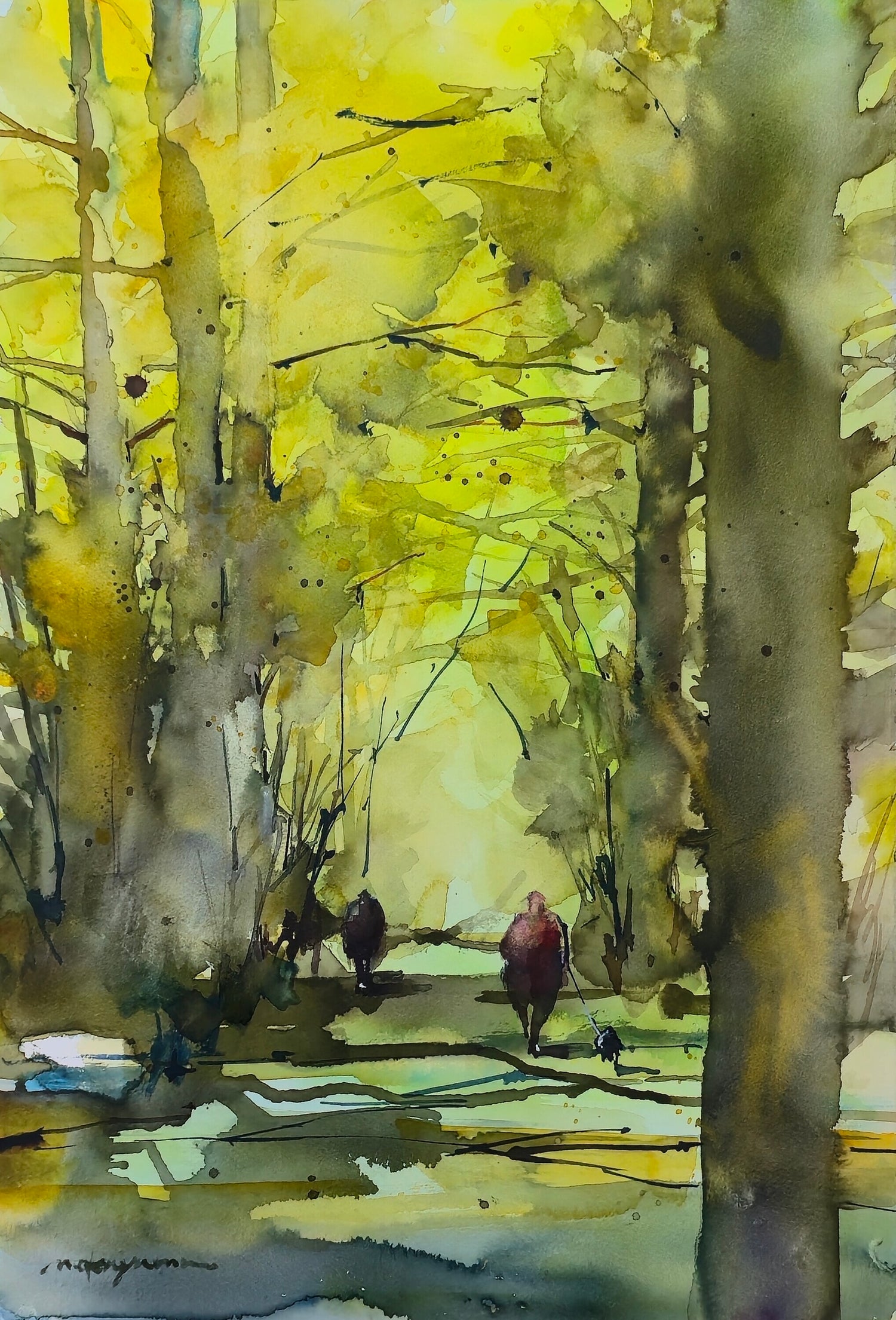 柔らかな木漏れ日の下を、ゆっくりと歩く人々の姿を描いた水彩画です。