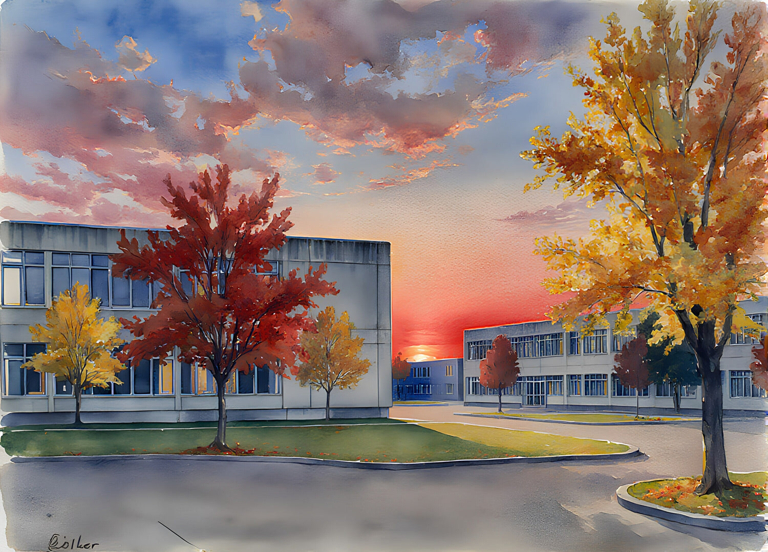 秋の夕暮れ時に学校を訪れると、日が落ちるところで、空は赤く青くなり、校庭の木々は色づいていた。