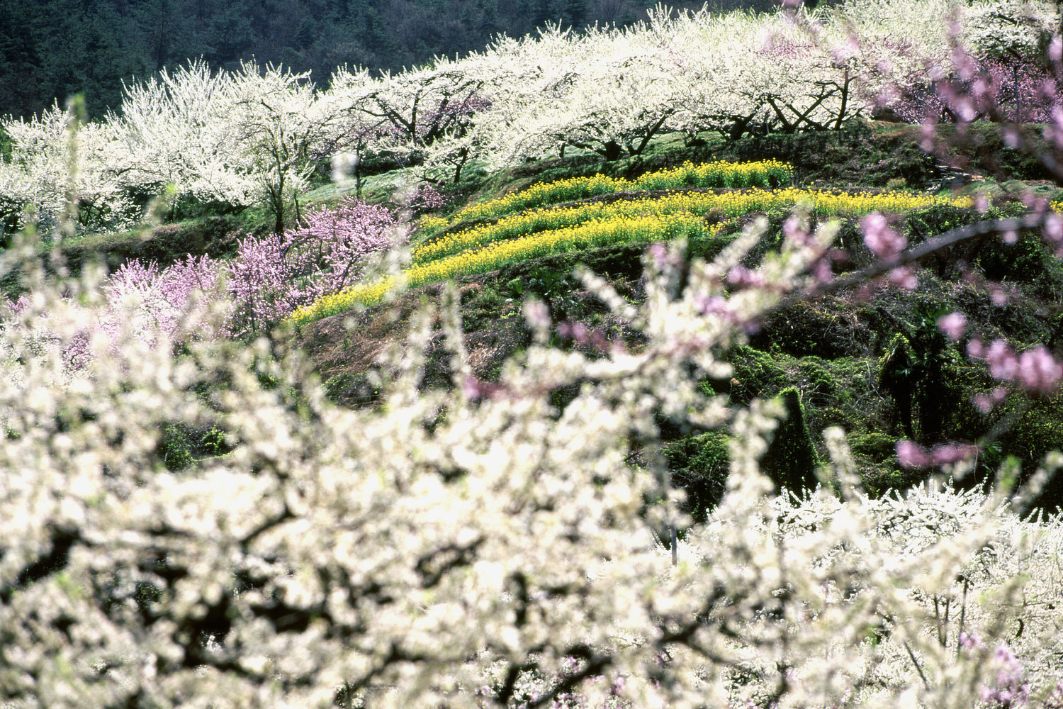紅白の桃の花、菜の花が咲く、色取り取りの風景。
