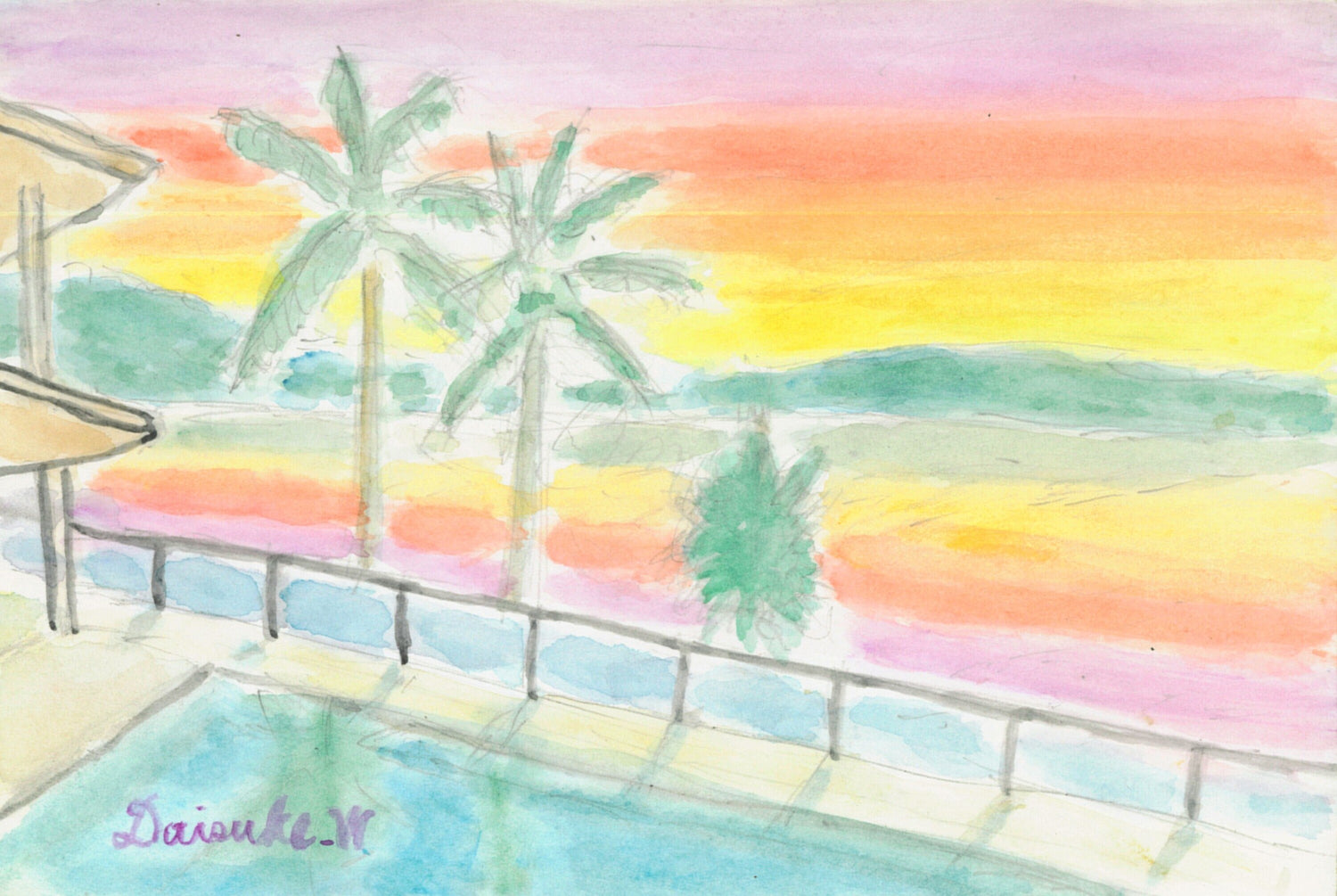 南国の雰囲気のある海岸にピンク色に焼ける夕焼けの雰囲気を出せるように描きました。