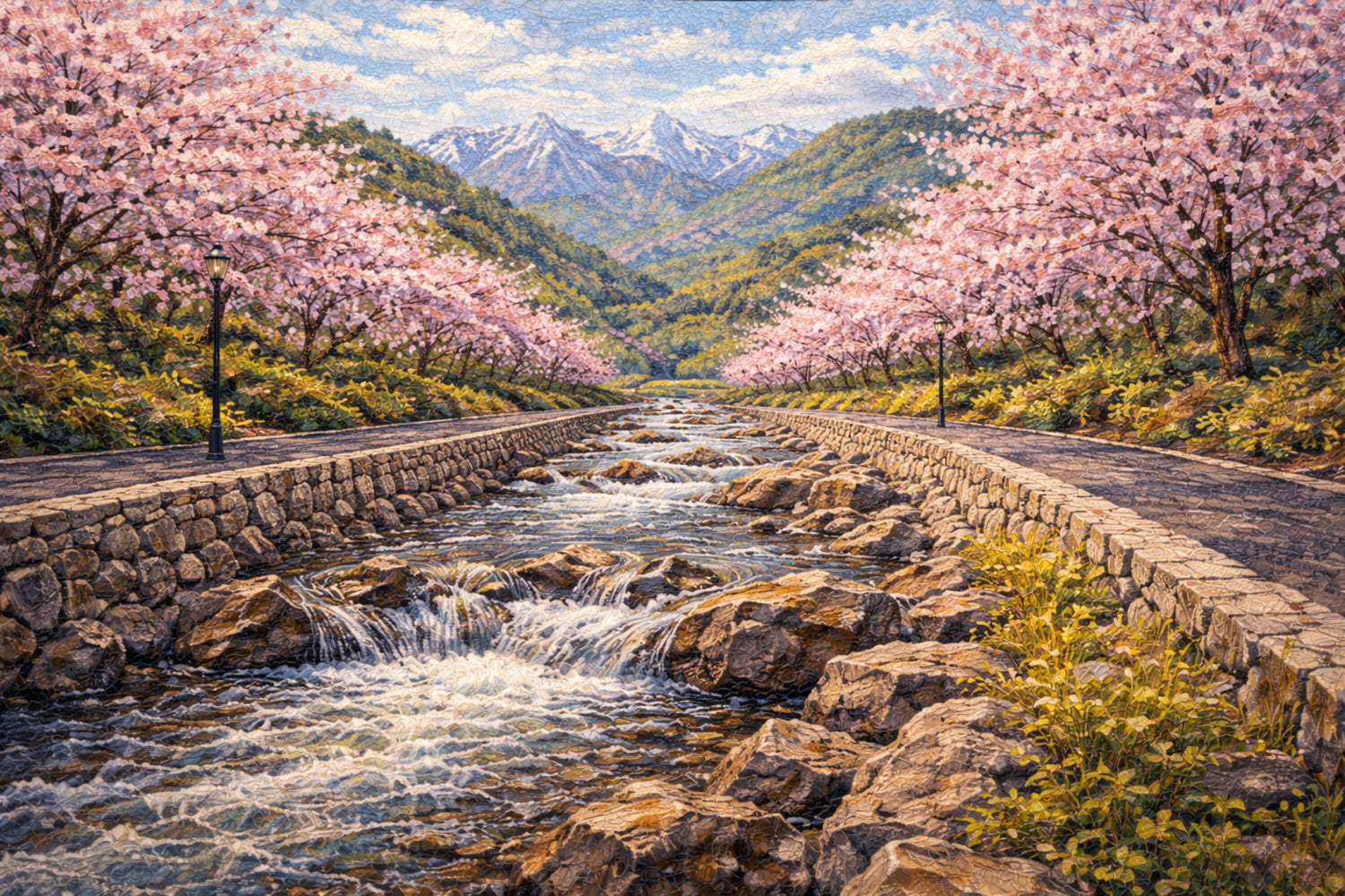 桜並木のせせらぎ、山へ続く道