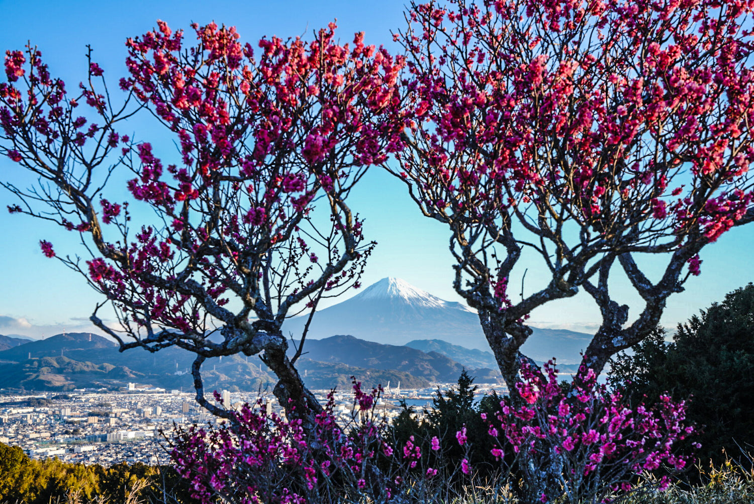 毎年楽しみにしている 梅の花が今年も咲きました 富士山がそっと見つめていました