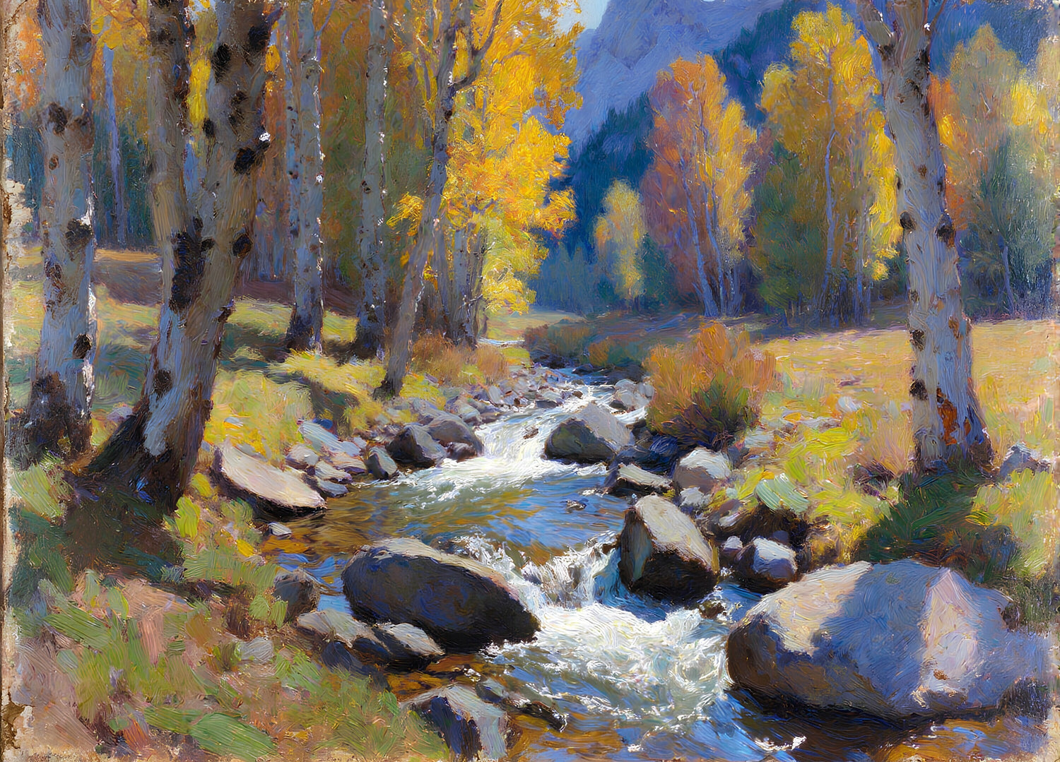 森の中を澄んだ小川が流れており、周りの木々が色づいている。