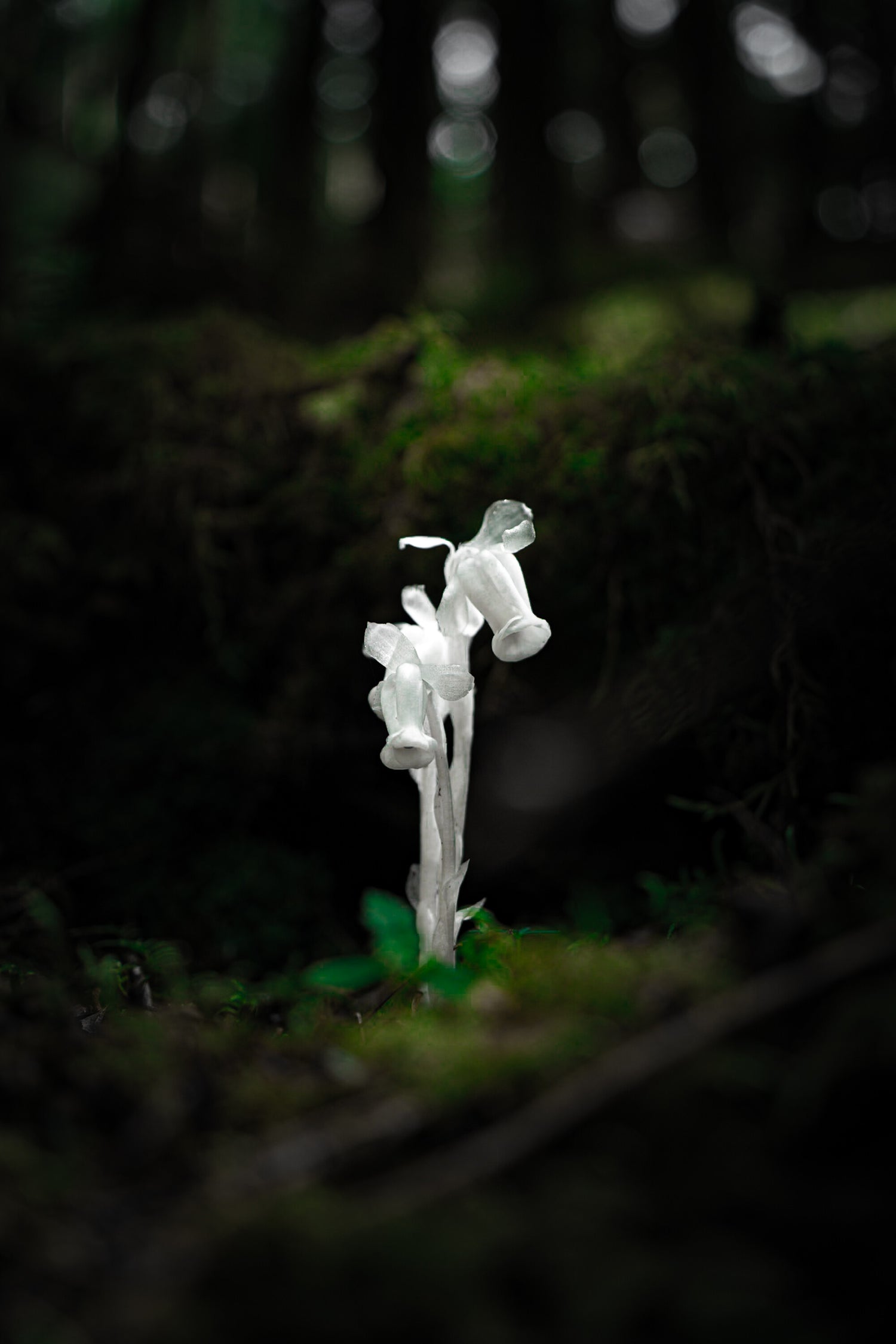 深い緑の苔むした地面からひっそりと現れた、透き通るような白い花。まるで暗闇に浮かび上がる幽霊のような、不思議な存在感を放っています。背景のぼやけた深い緑が、その白さをより一層際立たせる、神秘的な一枚です。