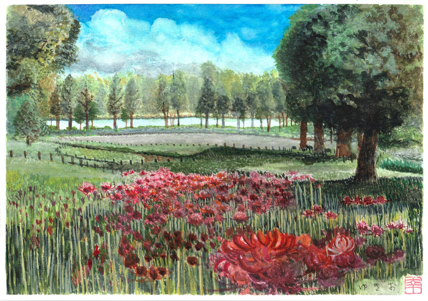 水彩画 水元公園の彼岸花の丘 まだ時期が早かったようで一部しか咲いていませんでした。