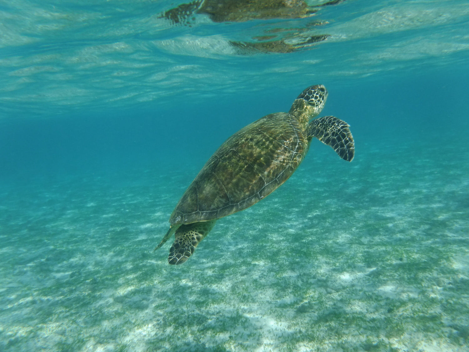 シュノーケルをしたときに撮れた、亀が水面に顔を出そうとしてる所です。