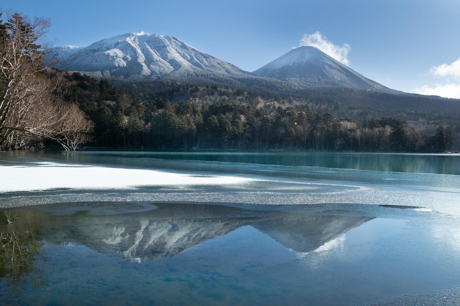 北海道のオンネトー湖は11月下旬から氷始めていきます。湖から望む雌阿寒岳と阿寒富士が美しいのです。