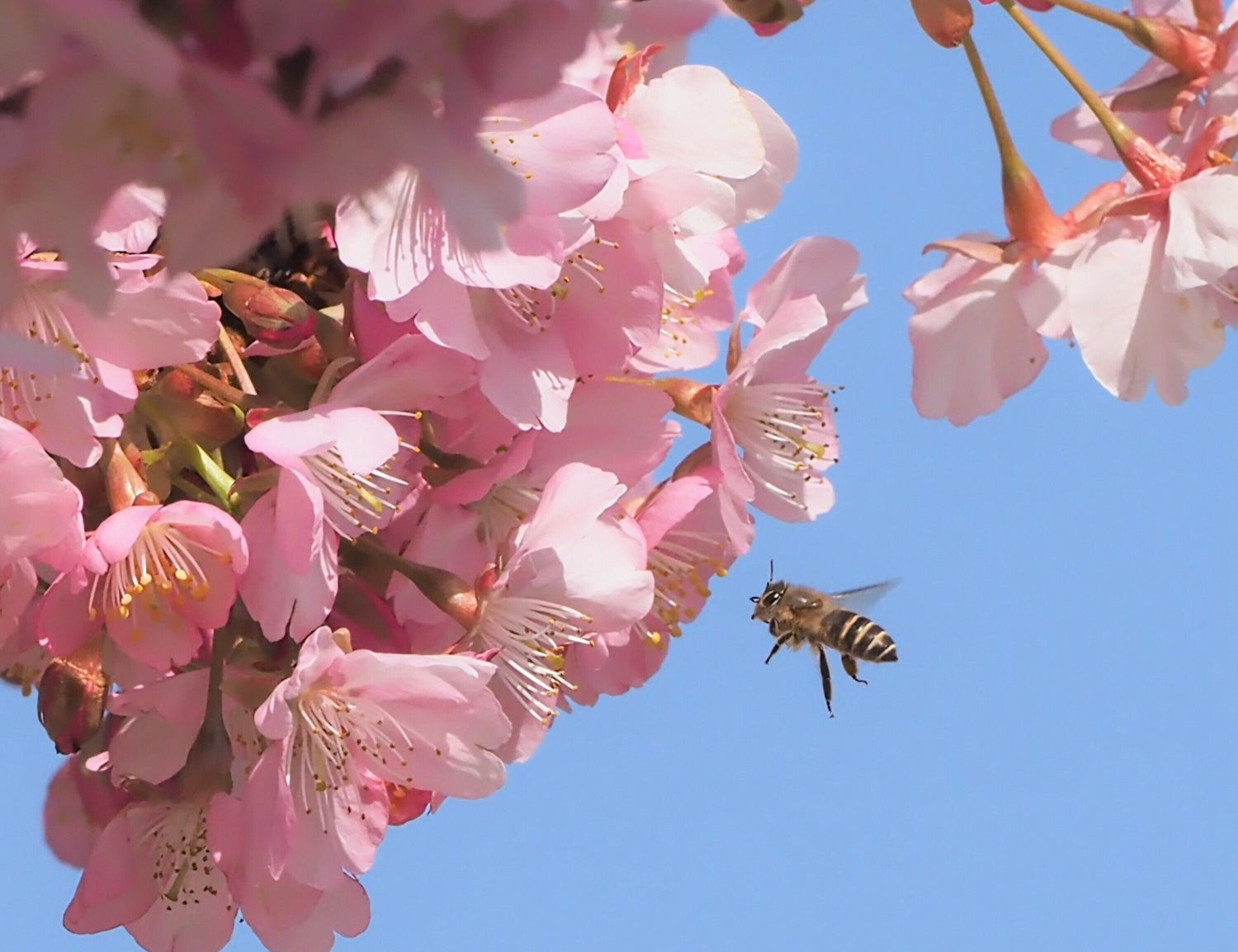 河津桜に沢山のミツバチが訪花していました。