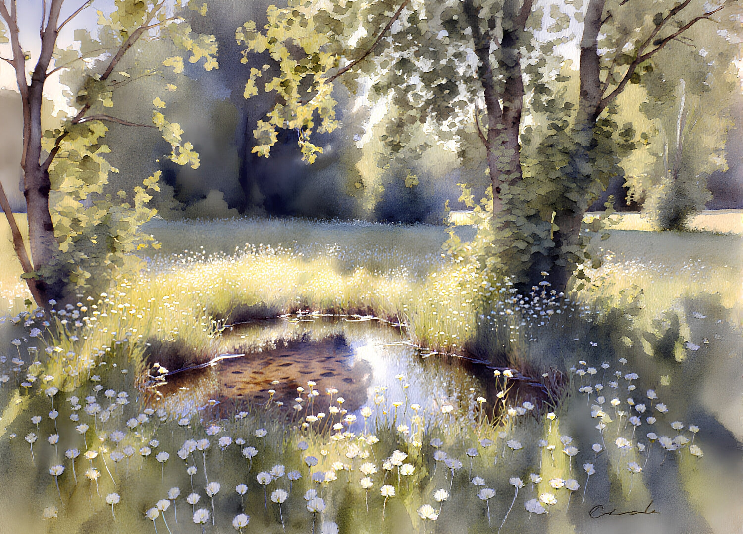 草原に湧き出た泉のまわりに暖かい春の日が差しています。