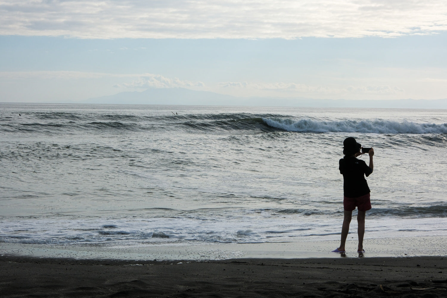 海岸を散歩していたら、波打ち際ぎりぎりのところに立ってイメラを構えている女性がいた。