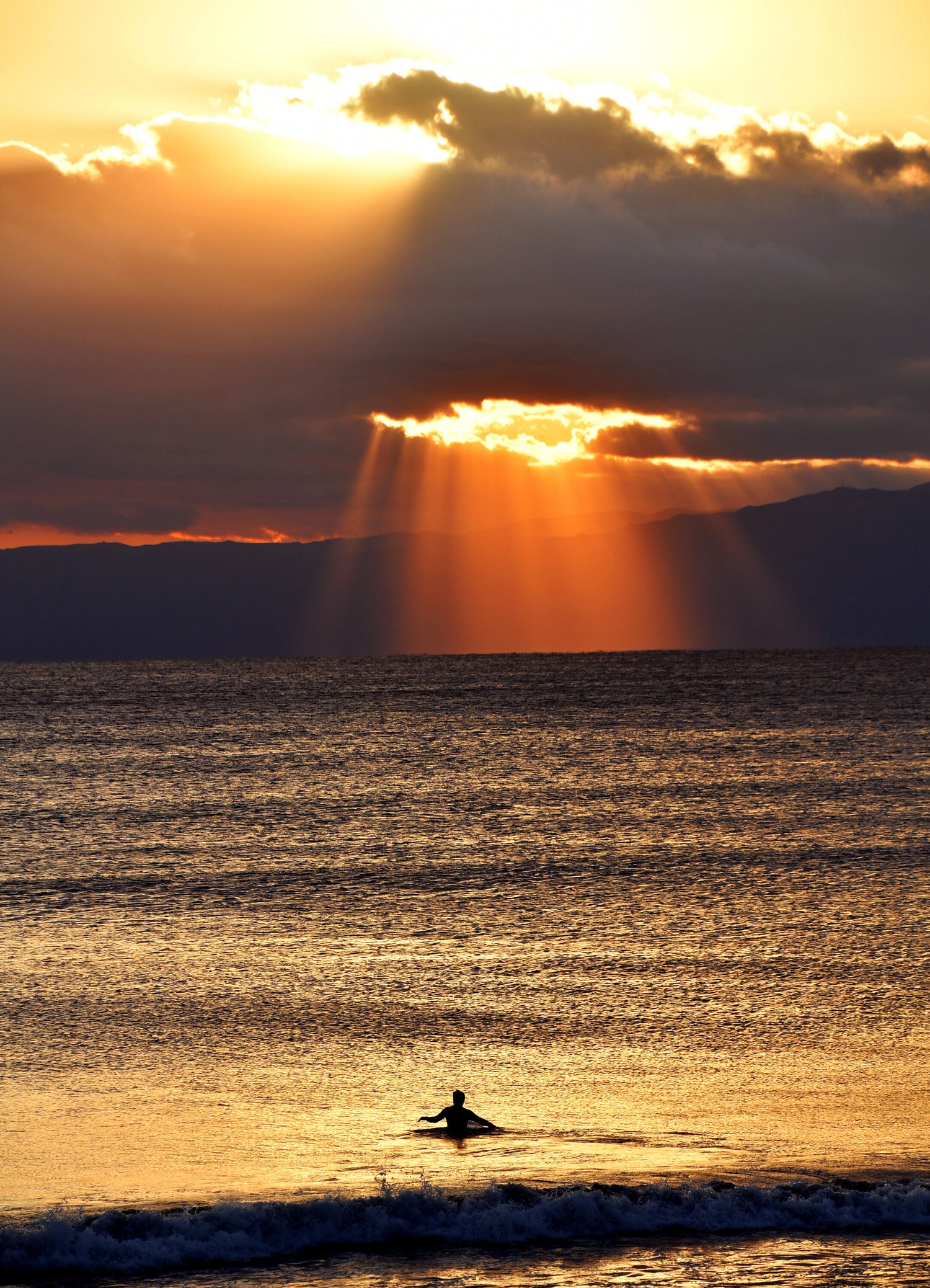 穏やかな波の海に出る。サーフィンには少し物足りないかもしれませんが、彼は祝福されているようです