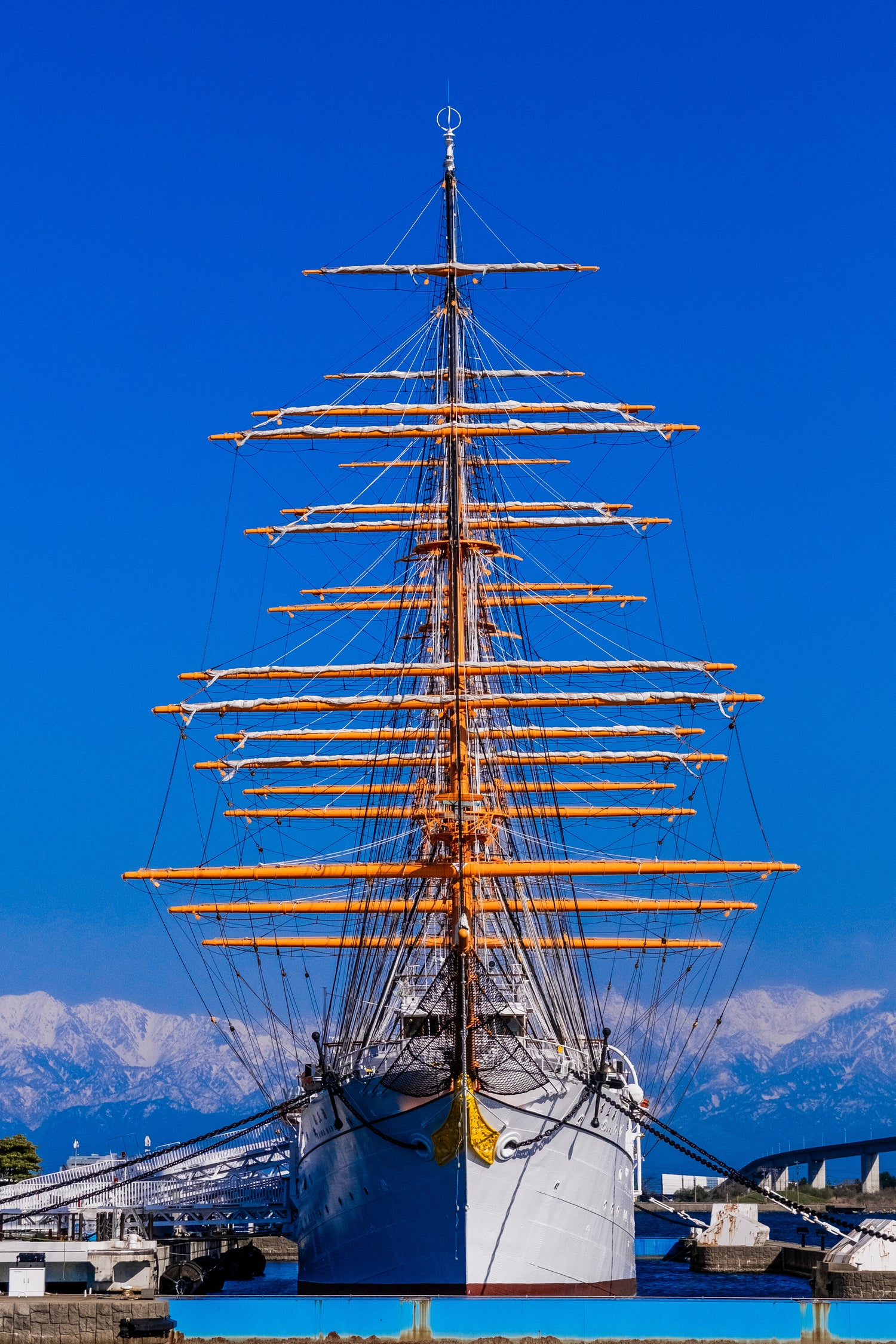 快晴の空にオレンジのマストが映えます、背景は立山連峰です。