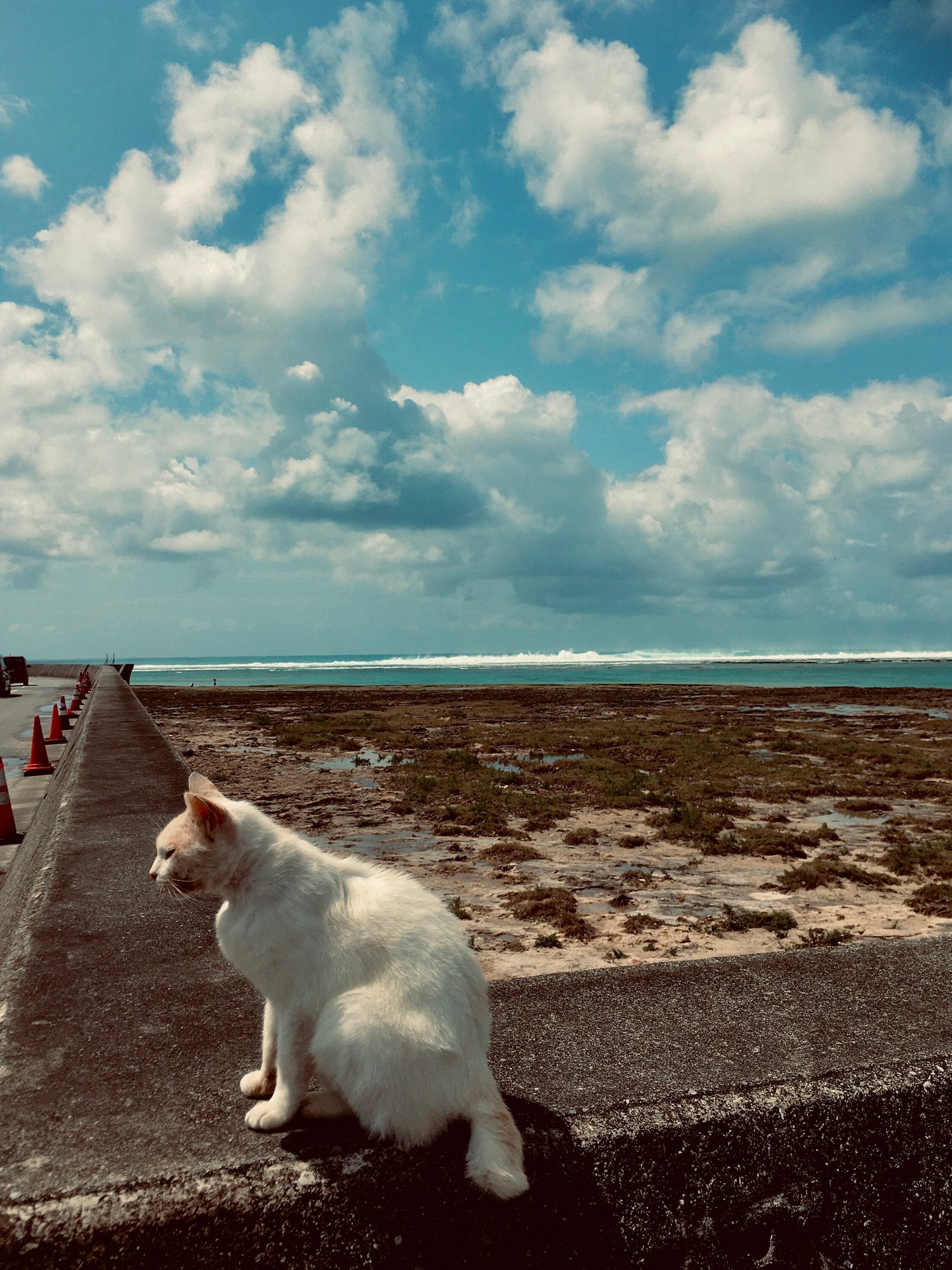 守り神の如き白猫。今日も海辺をパトロール。見つめる先は平和な日常。