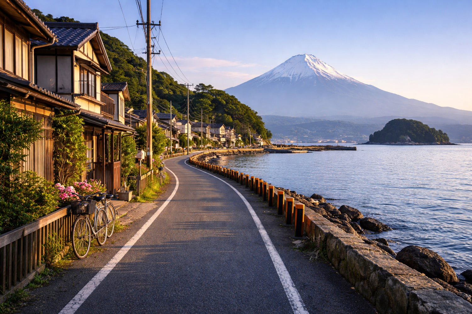 海沿いに伸びる細い道が、町並みを縫うようにゆるやかにカーブしていく。軒先の花や停められた自転車が、ここで営まれてきた日常の時間を物語ります。