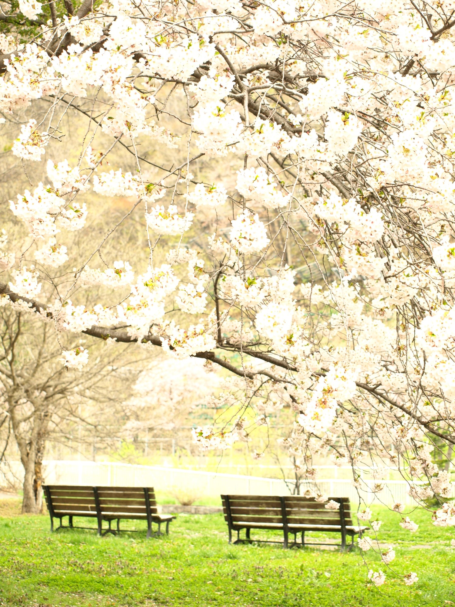 淡いピンク 桜とベンチ 癒しの春景色