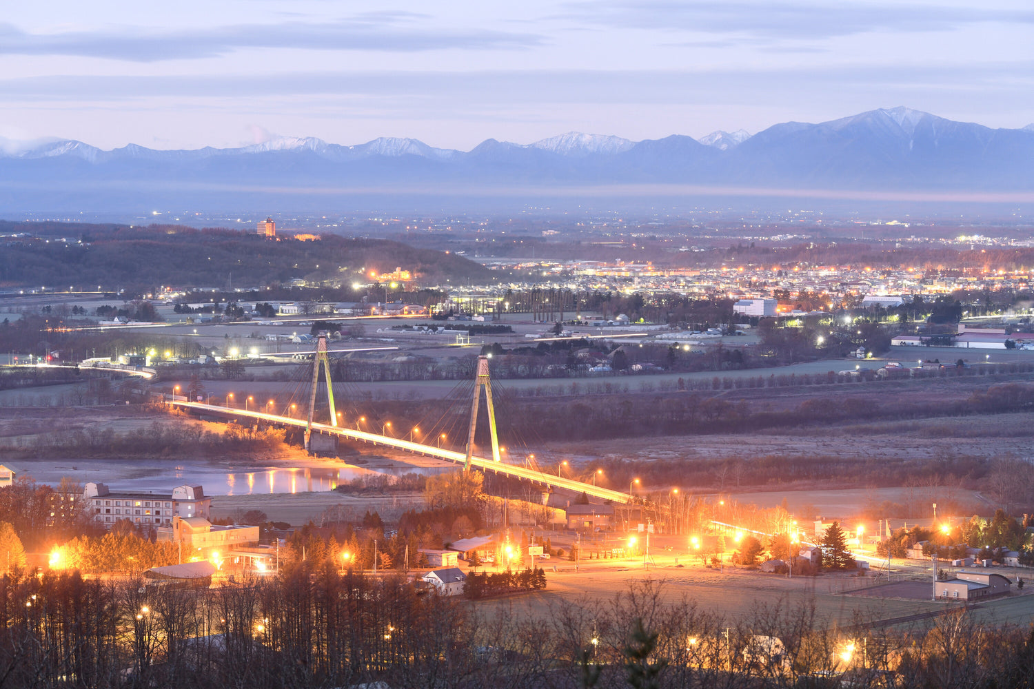 北海道十勝川温泉街から帯広市までの朝風景で、日高山脈のスケールの大きさは圧巻です