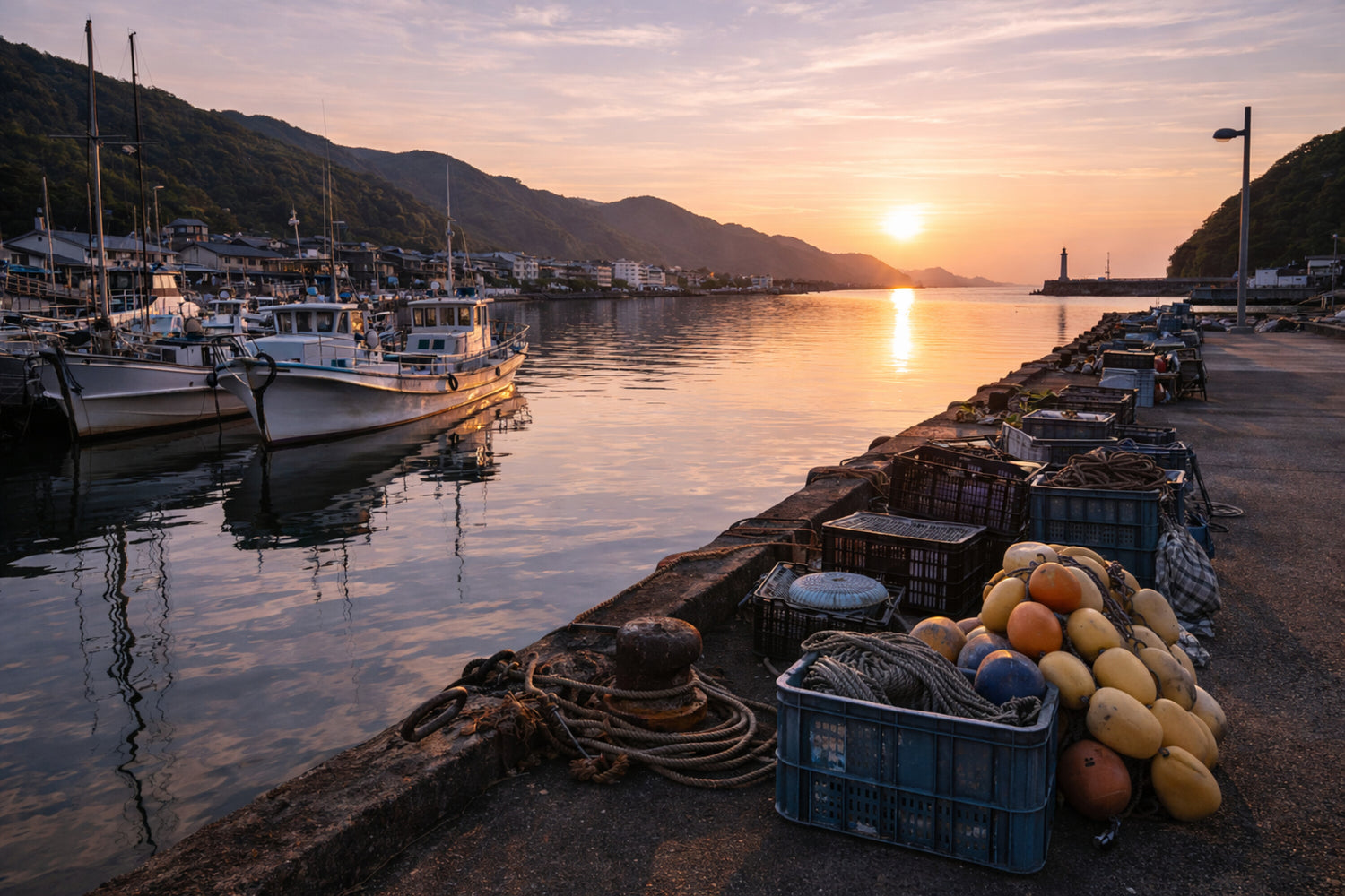 係留された漁船、桟橋に並ぶ浮きやロープ、使い込まれた道具たちは、