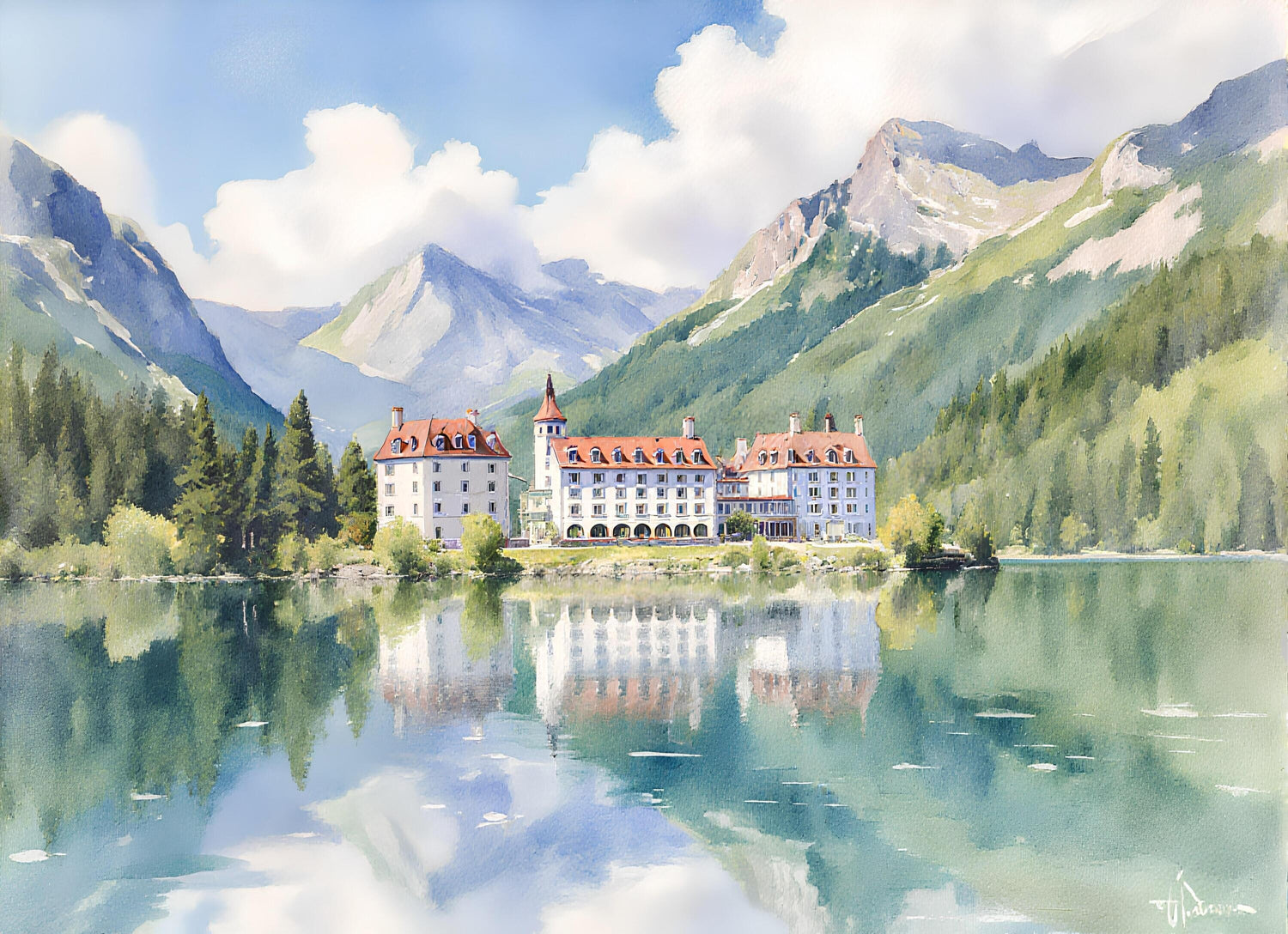 湖畔にホテルが建っています。初夏の頃で、清々しい天気です。