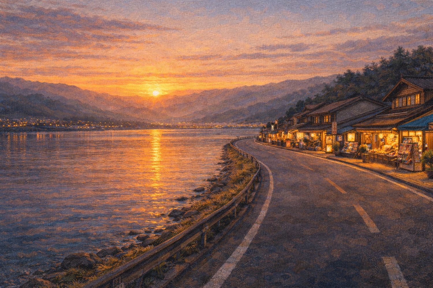 水面に映る光と、ゆるやかに続くカーブの道が、自然と視線を奥へと導き、物語の中へ誘います。
