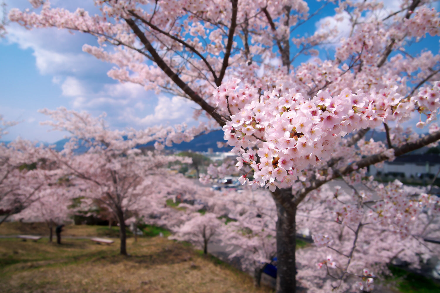 この作品は、視線を花の細部に向けながらも、その奥に街の風景を感じ取れるよう構成されています。桜の木々がリズムよく並び、丘の斜面を彩る姿は、自然の壮大な演出のようです。都市生活のなかでも、こうして春を感じられる場所があることの豊かさを再認識させてくれる写真であり、訪れる人々に心の余白を与える景観です。