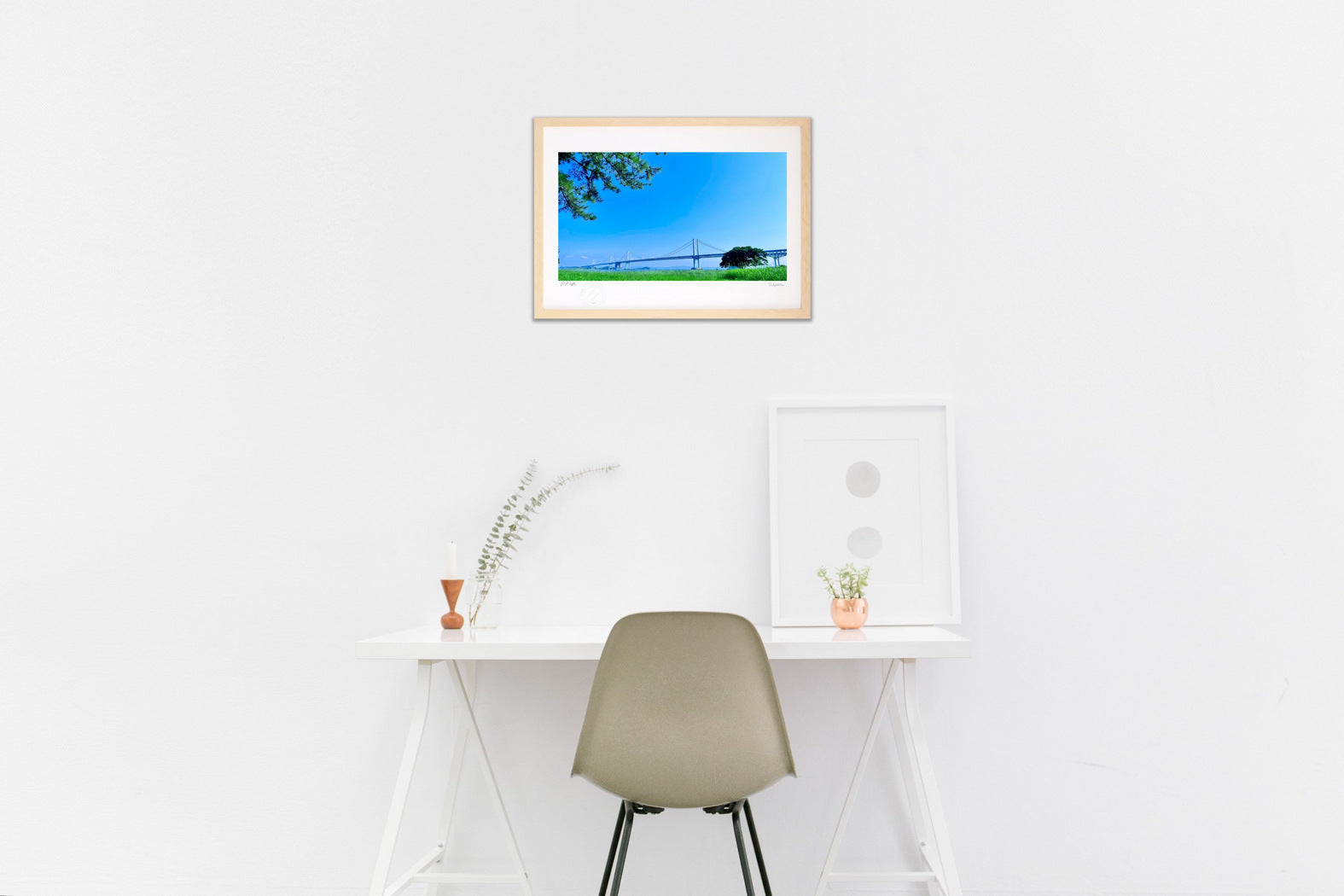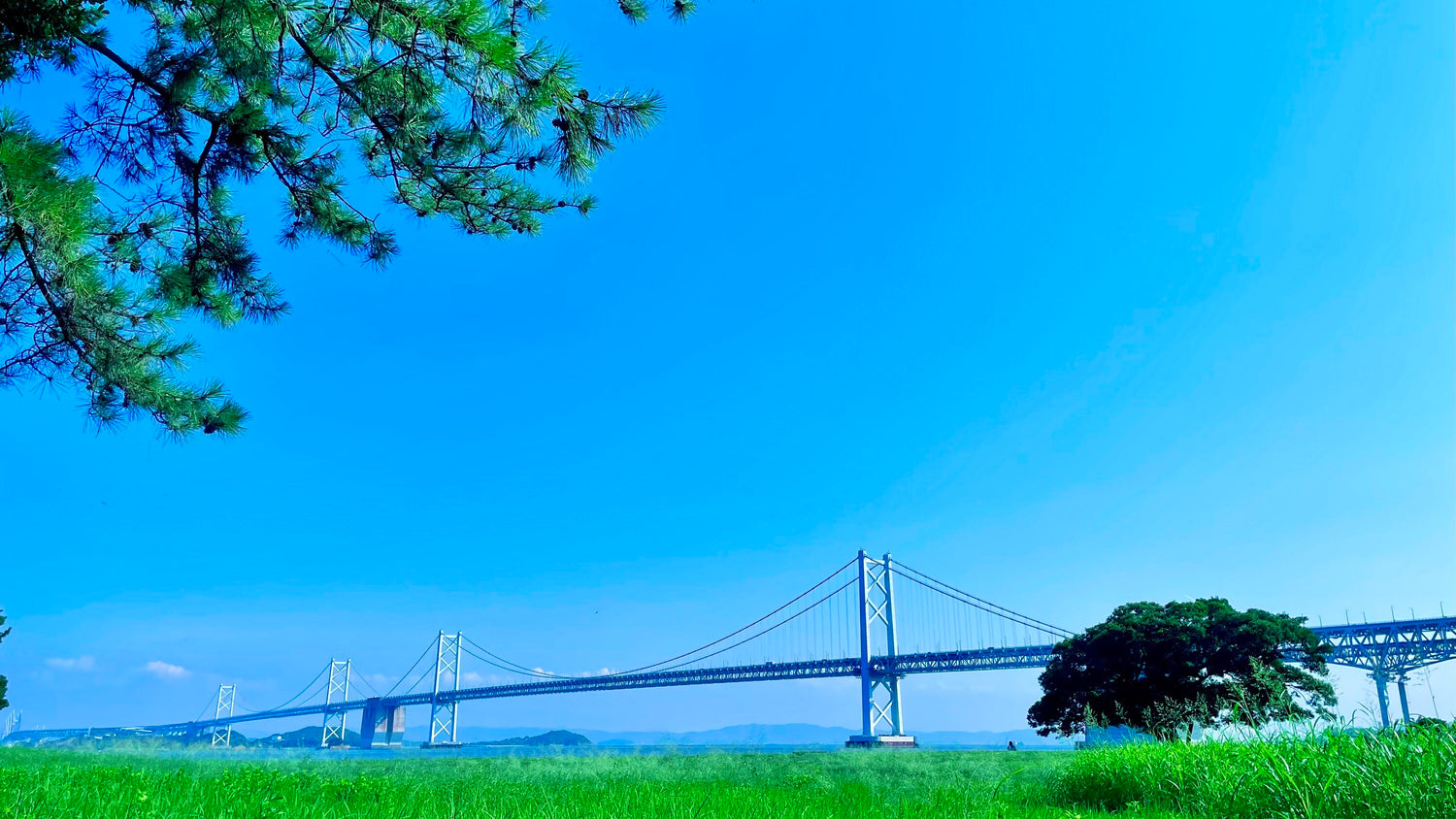 瀬戸内海に架かる橋を、広がる青空と鮮やかな緑の中で捉えた一枚です。