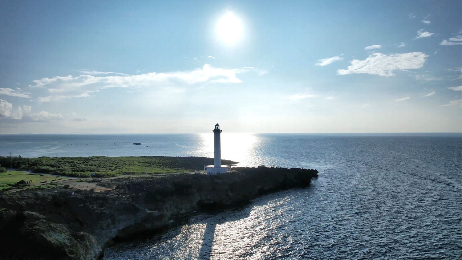 断崖の先に立つ白い灯台と広がる大海原、沖縄最北の絶景