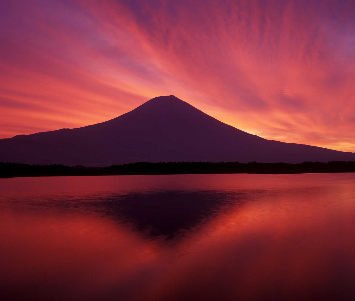 田貫湖の朝 湖面に富士山の投影赤く焼けた雲が 感動的なひと時を見せてくれた。