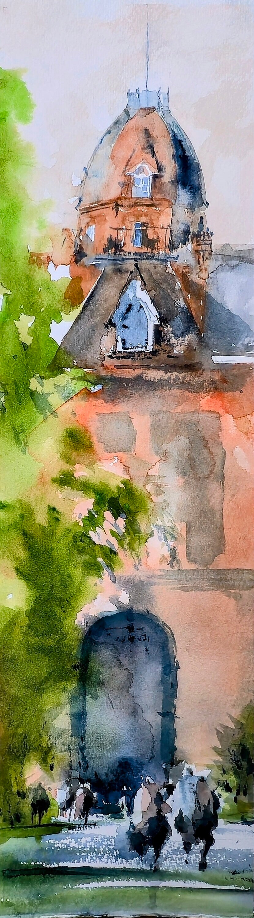 札幌の街に佇む北海道庁旧本庁舎。赤煉瓦の壁面に刻まれてきた時間と、そこを行き交った無数の人々の気配を、水彩ならではのにじみと省略で描いた作品です。