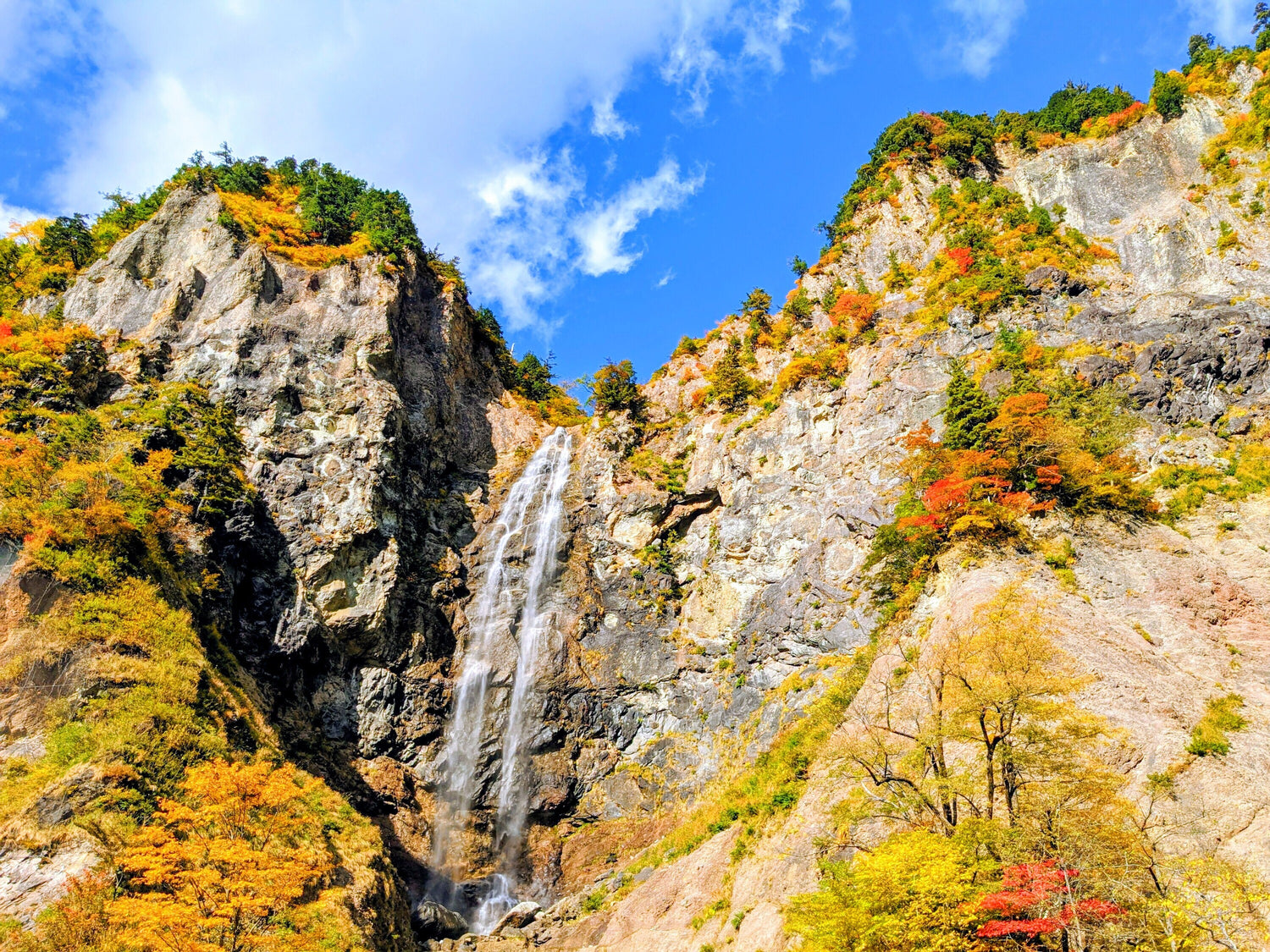 白い岩肌に映える色とりどりの紅葉が、金襴銀襴と称されていて、荘厳な滝と相まって美しいです。