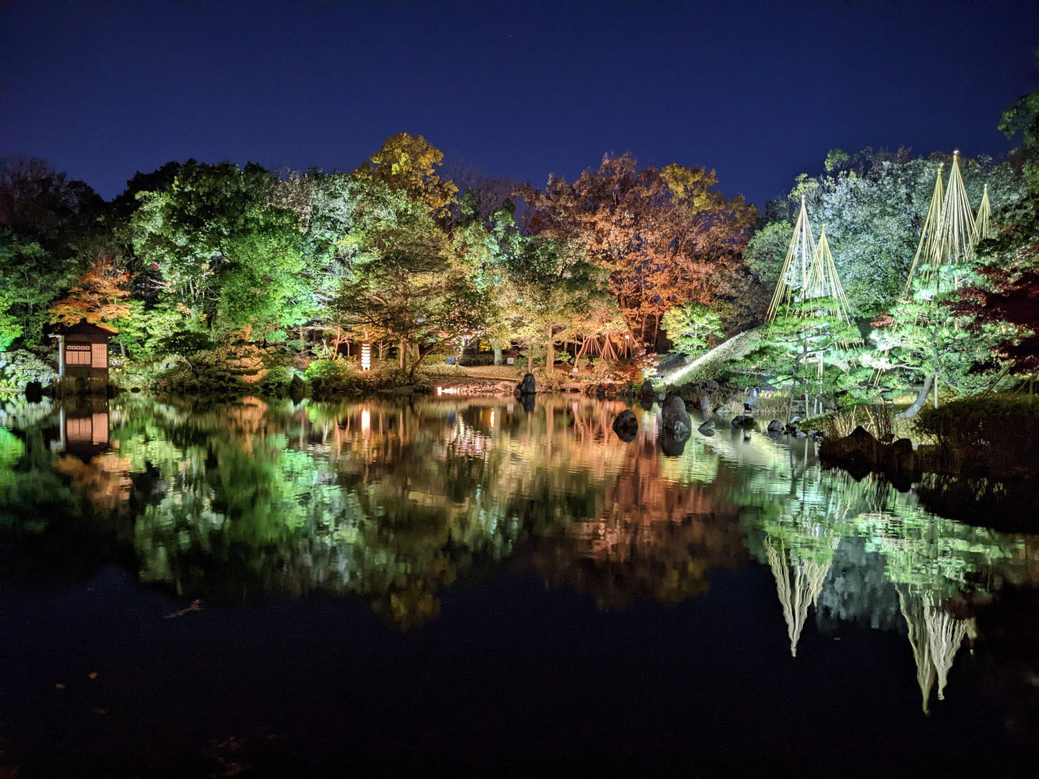 ライトアップされて静かな湖面に映る秋の紅葉と、逆さ雪吊りが幻想的な雰囲気を醸し出しています。