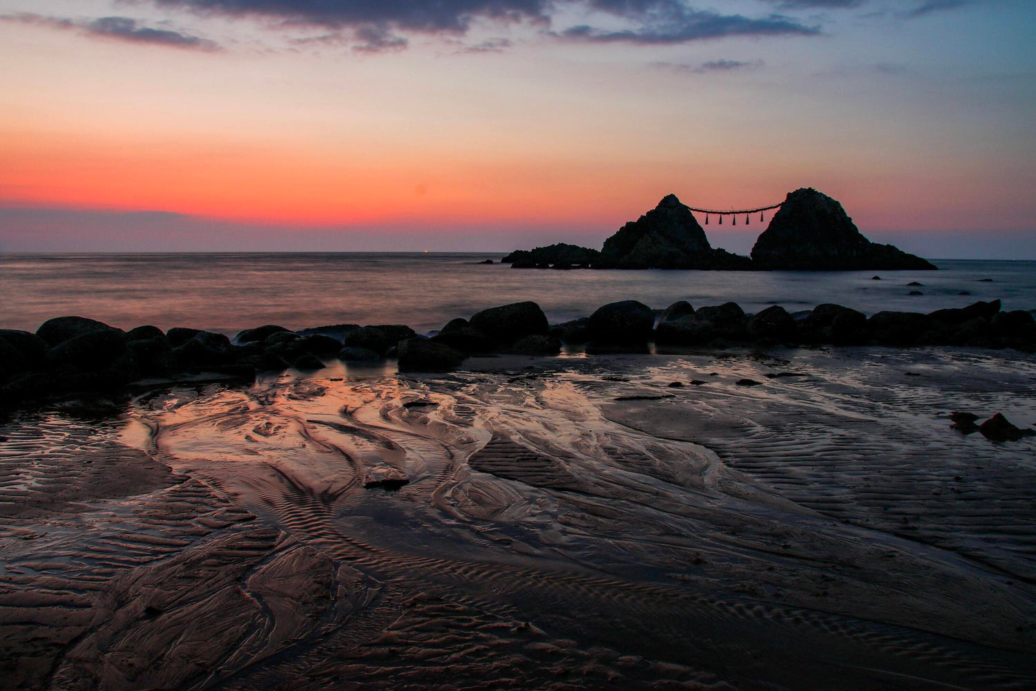 糸島の夫婦岩が佇む海岸。