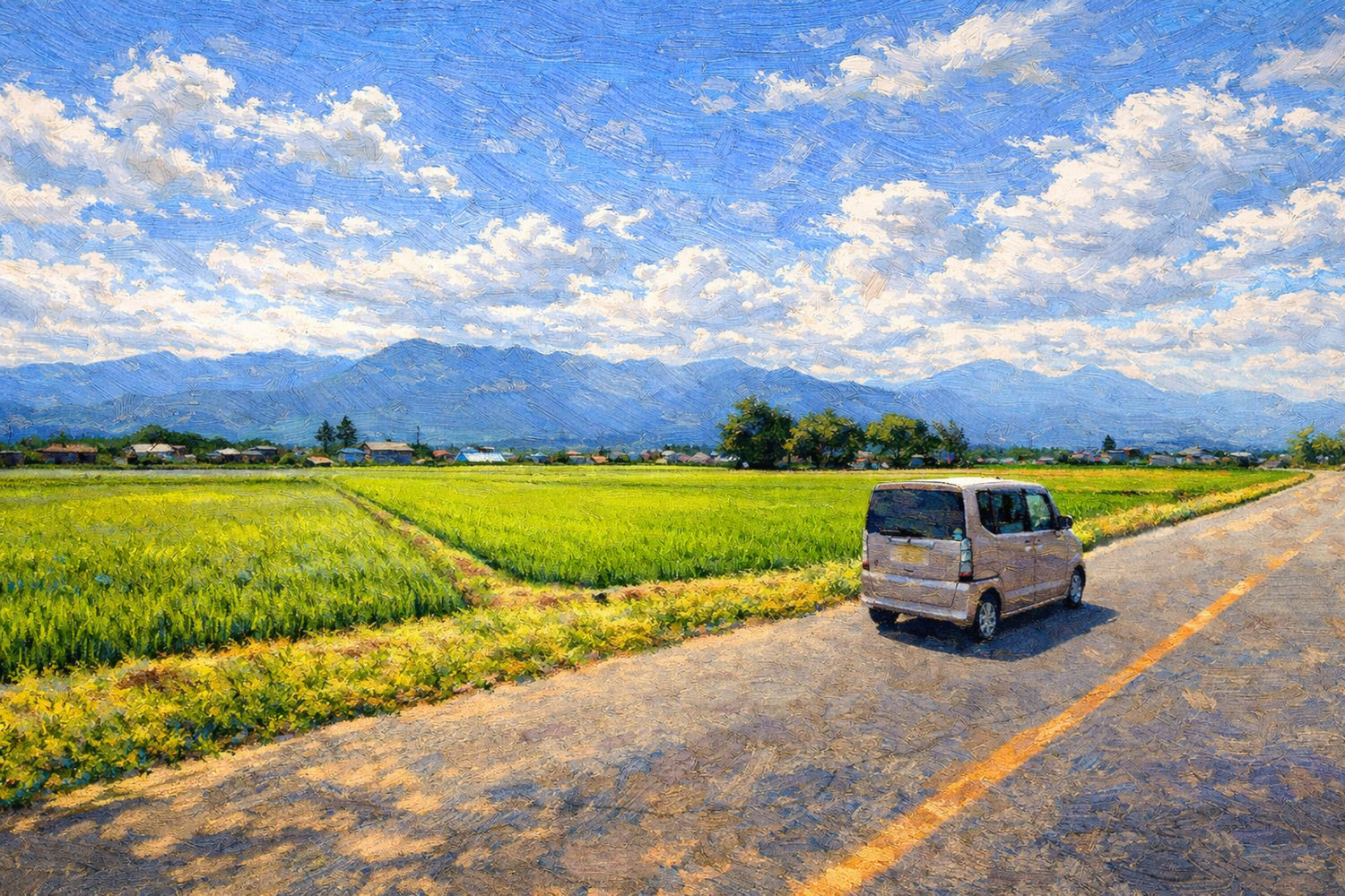 広がる田園と青空の下、静かな道を一台の車が進んでいく。