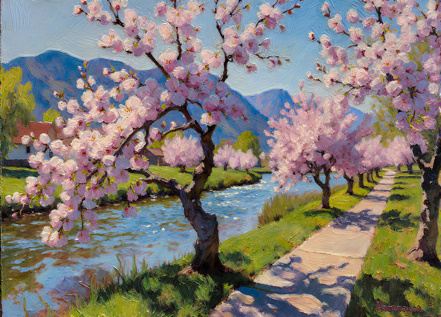 田園地帯を流れる川の堤防に桜がたくさん咲いている。