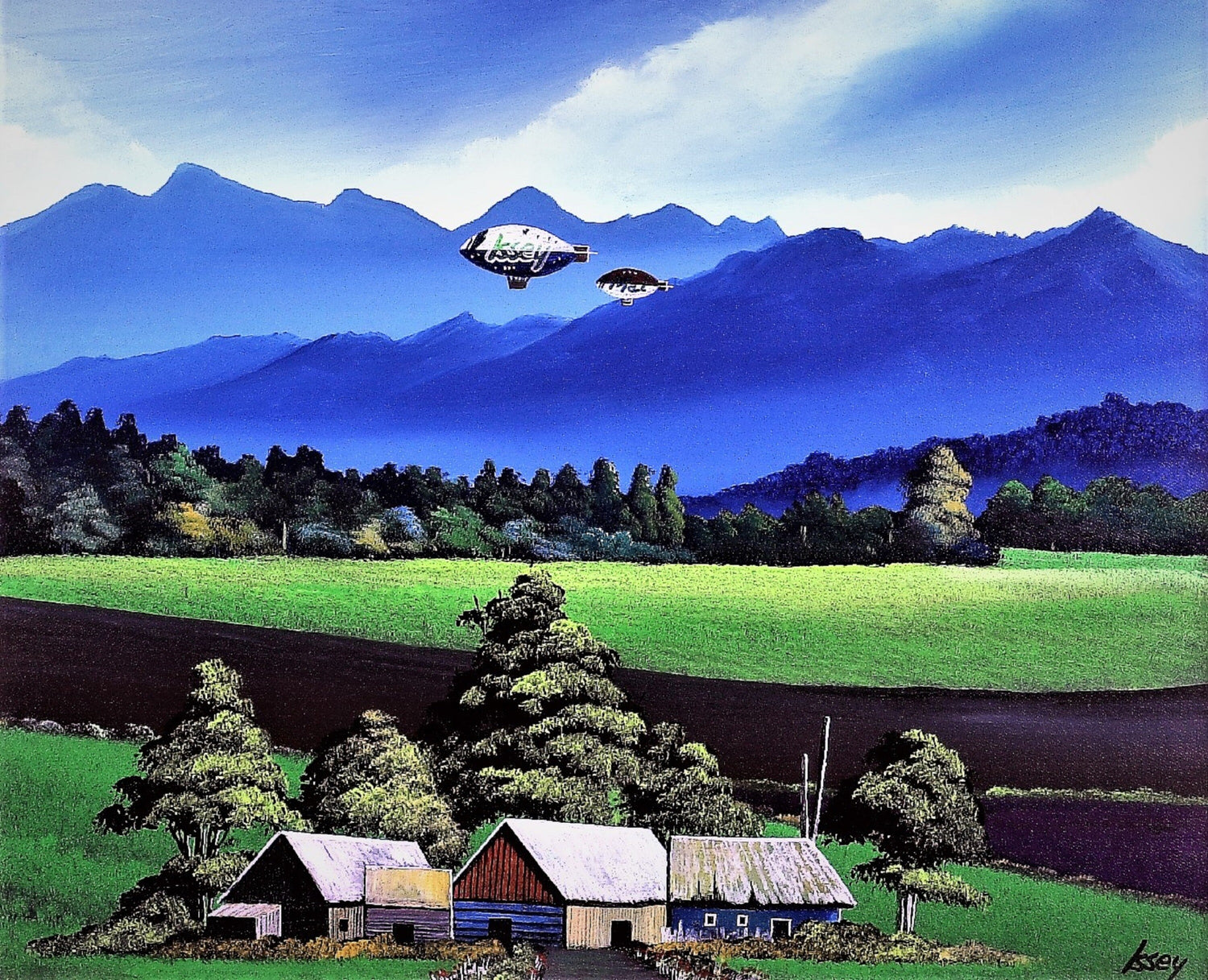 田舎の上空を飛ぶ飛行船‥‥景色のいい民家が寂しそう。
