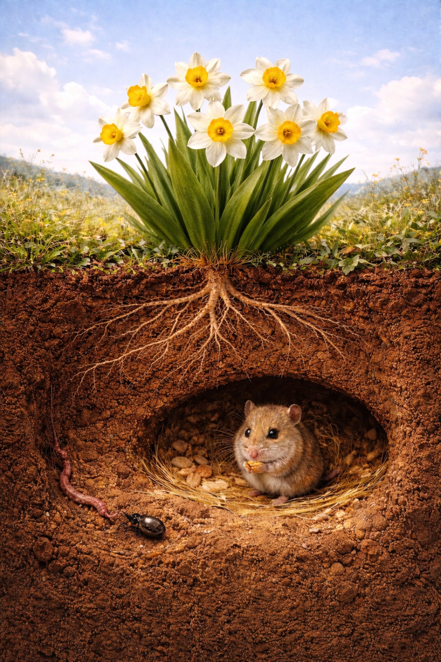 地上の穏やかな季節感と、地下で続く確かな生活を断面構図で描き、自然が持つ二重の世界を一枚に凝縮しました。