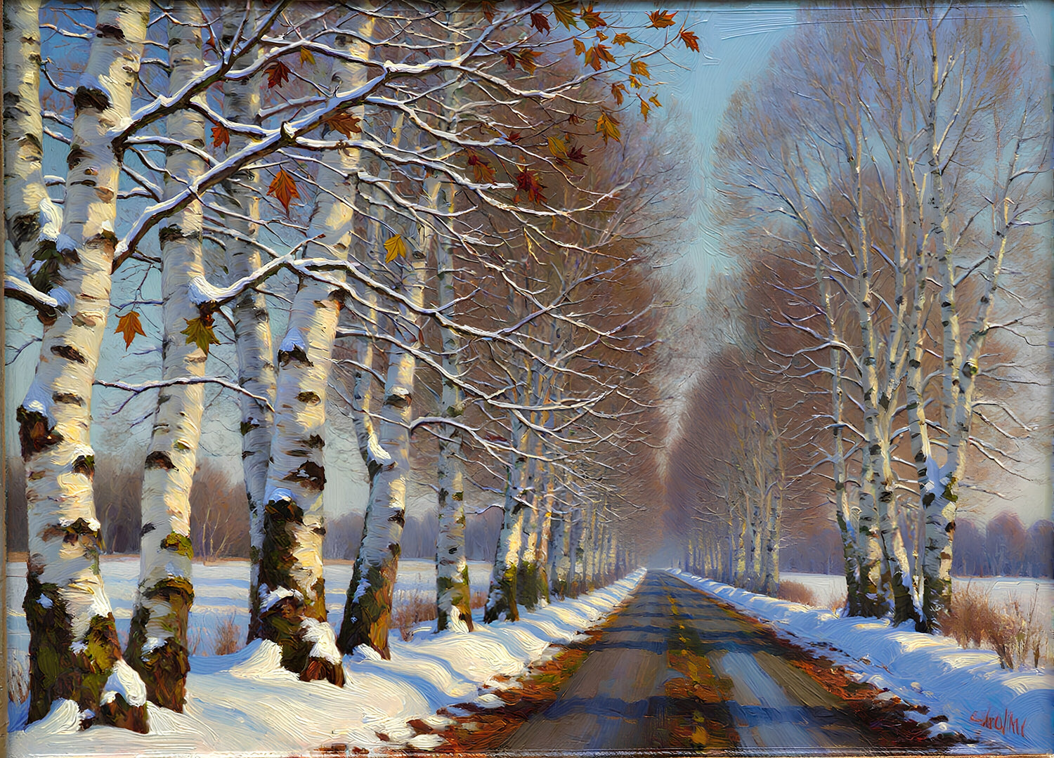 葉が落ちた白樺の枝に雪が積もって白くなっている。