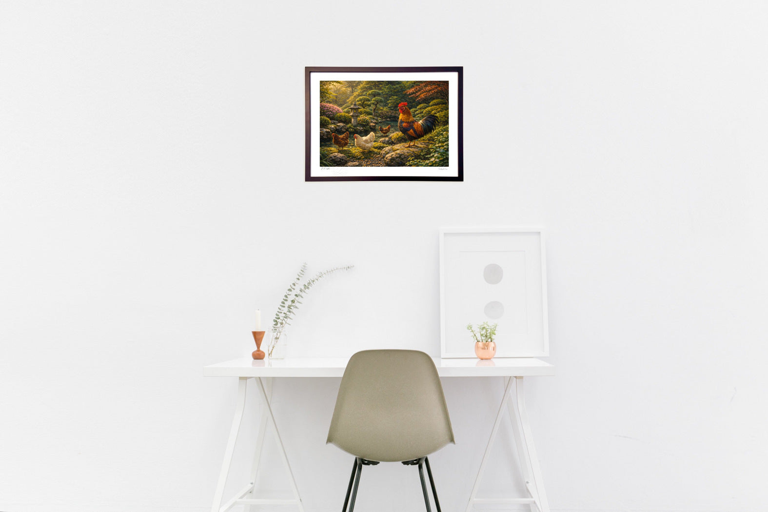 石灯籠と太鼓橋が佇む日本庭園に、小川のせせらぎが静かに響く。苔むした岩、木漏れ日、花の彩りに包まれて、鶏たちは思い思いに歩き、雄鶏は赤い冠を掲げるように凛と立ちます。整えられた景色の中に、羽音という“生きた気配”を重ね、和の静けさと温かな暮らしの記憶を描きました。飾るほどに心がほどけ、深呼吸したくなる一枚です。