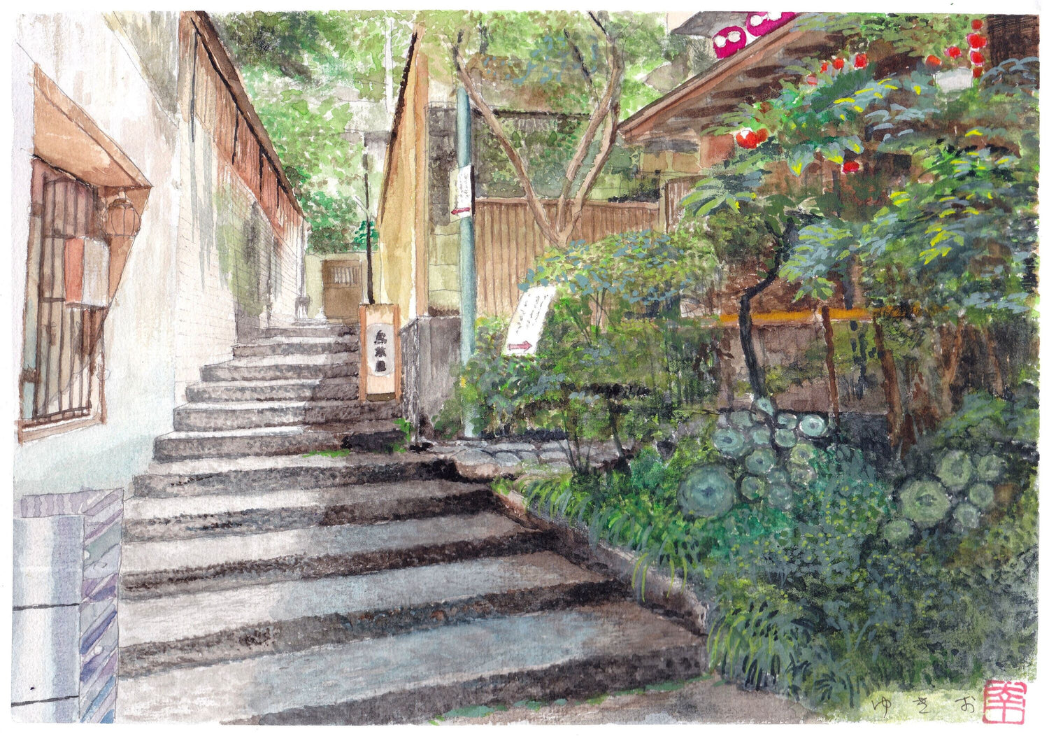 水彩画 神楽坂の路地裏 鳥茶屋別亭の前