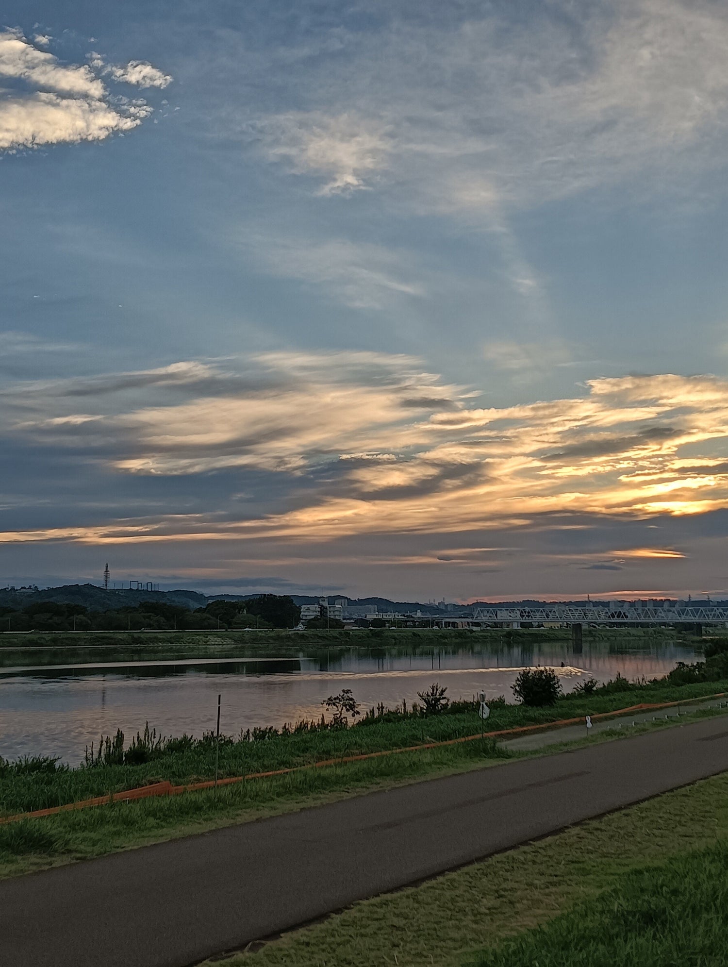 夕方、川沿いを歩いてたら、なんとも美しい夕日が見えた。