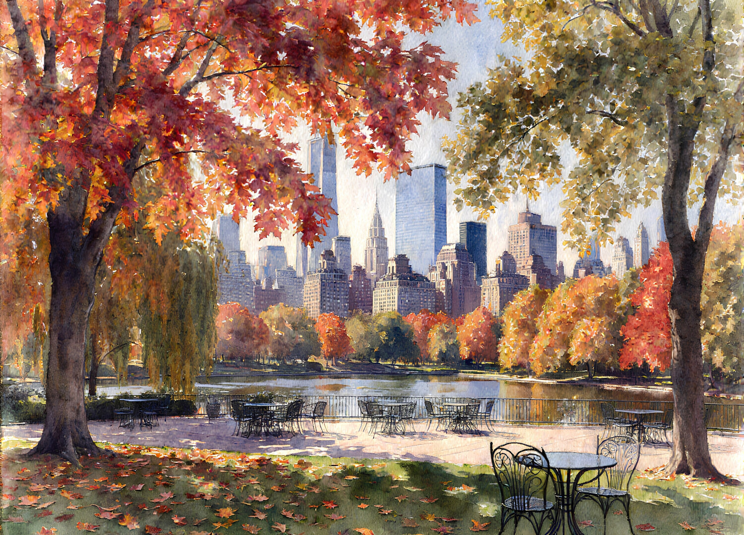 ニューヨークのビル群を背景に、燃えるような紅葉が広がる景色