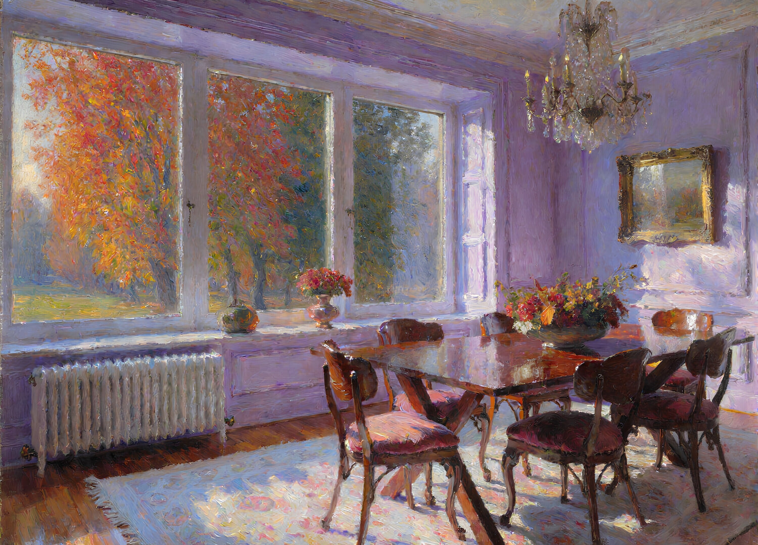 薄い赤紫を主体としたダイニングルームから紅葉した木々が見える。