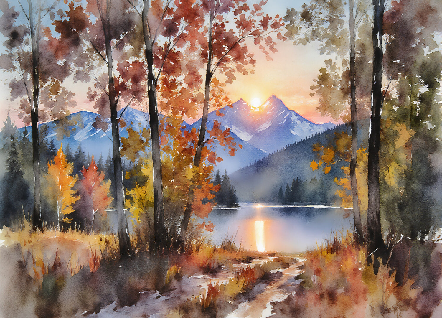 晩秋の風景です。高原の湖の向こうの山から日が昇ります。