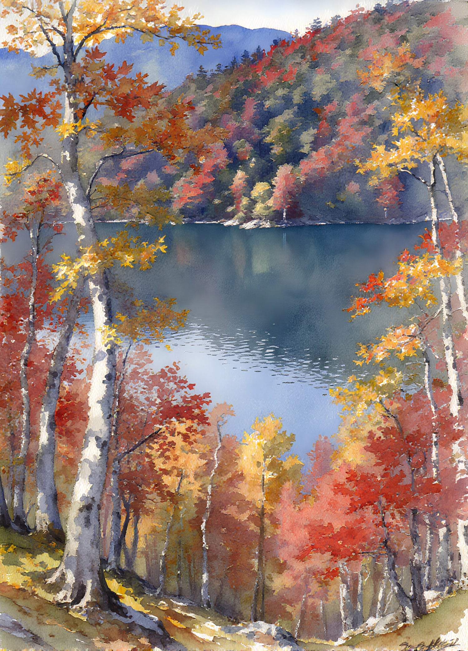 湖のまわりの山の木々が赤や黄色に紅葉しています。