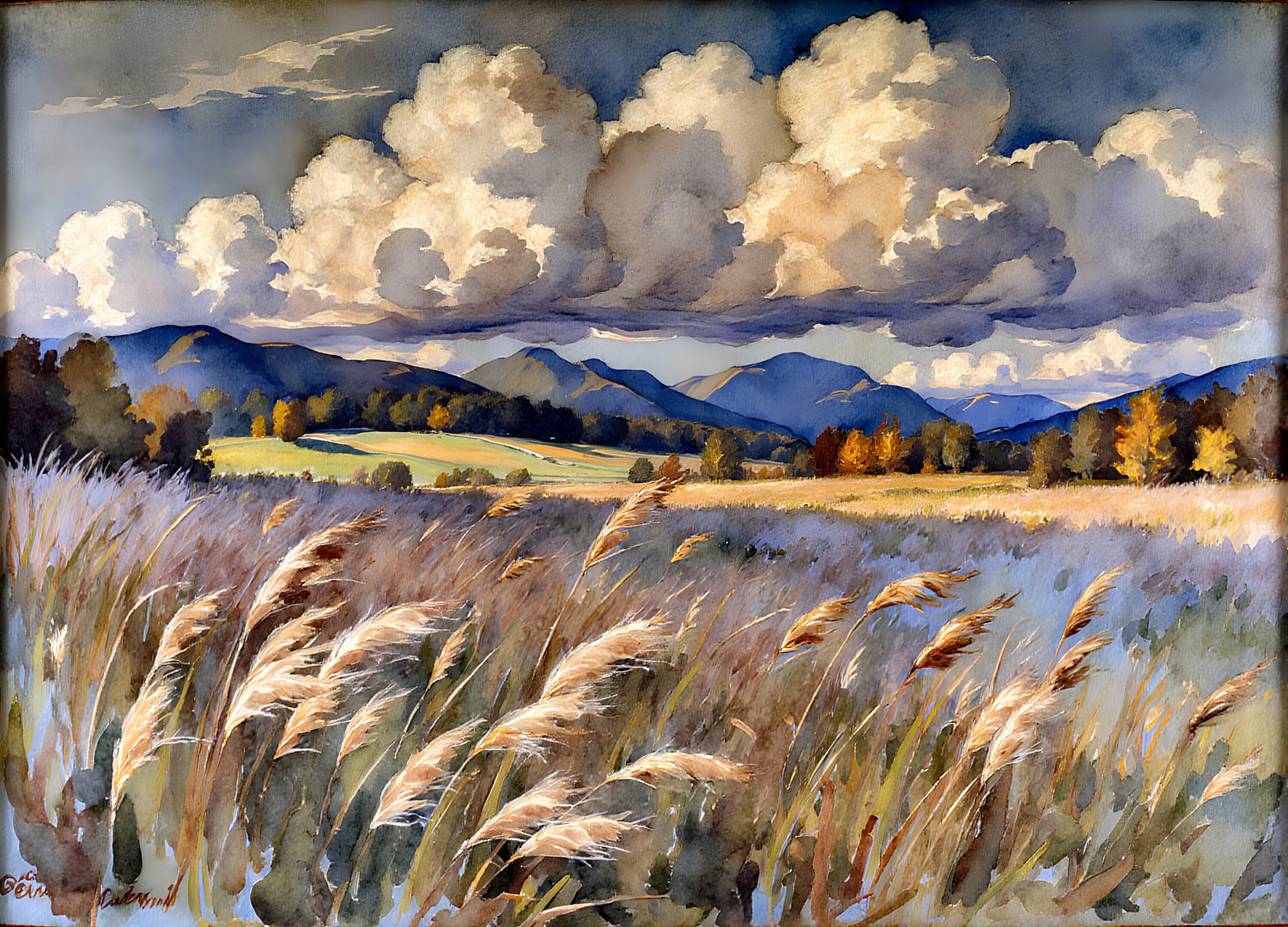 秋の草原の朝、高積雲が流れ、枯れた草が風に吹かれて、木々が色づいています。