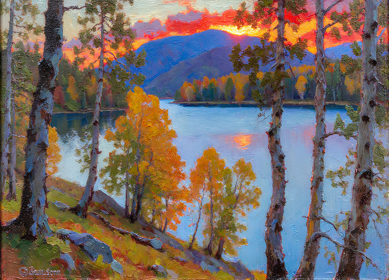 湖の周りの木々が色づいている。
