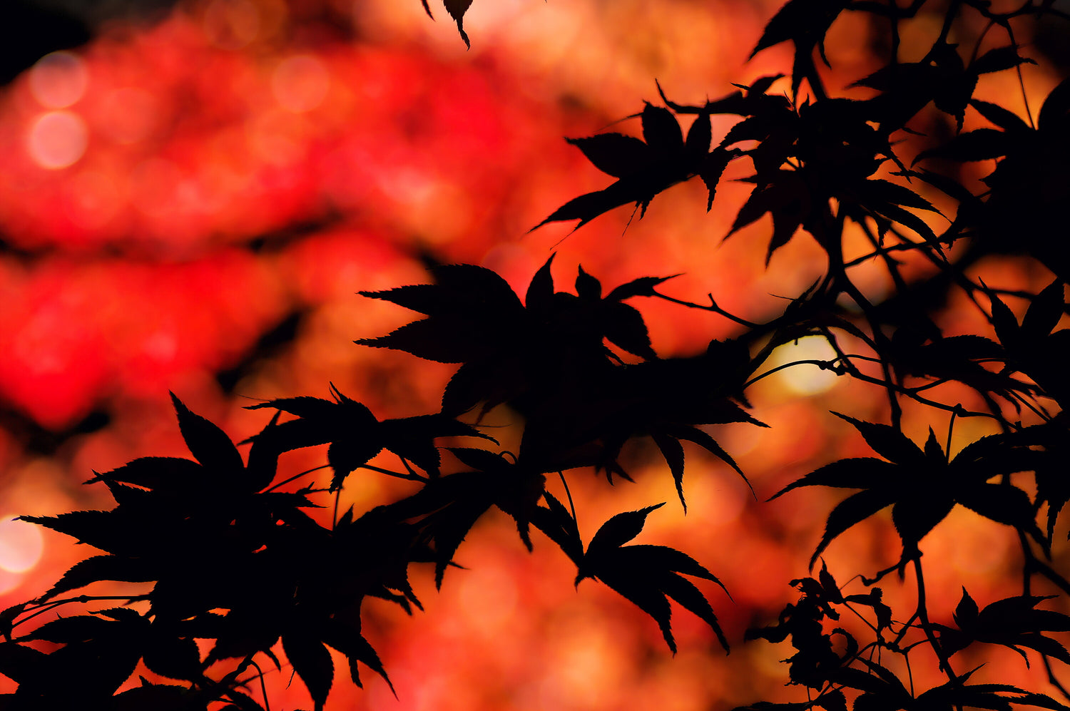 この写真は、まばゆく光る紅葉を背景に、もみじの葉をシルエットで捉えた一枚です。