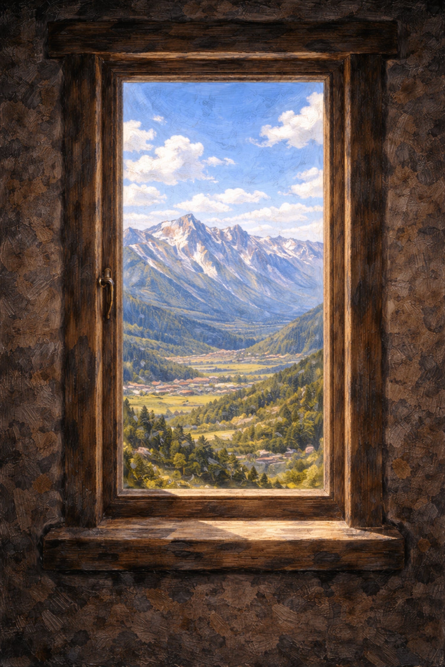 古い木枠の窓の向こうに広がるのは、澄んだ空気に包まれた高原の風景。