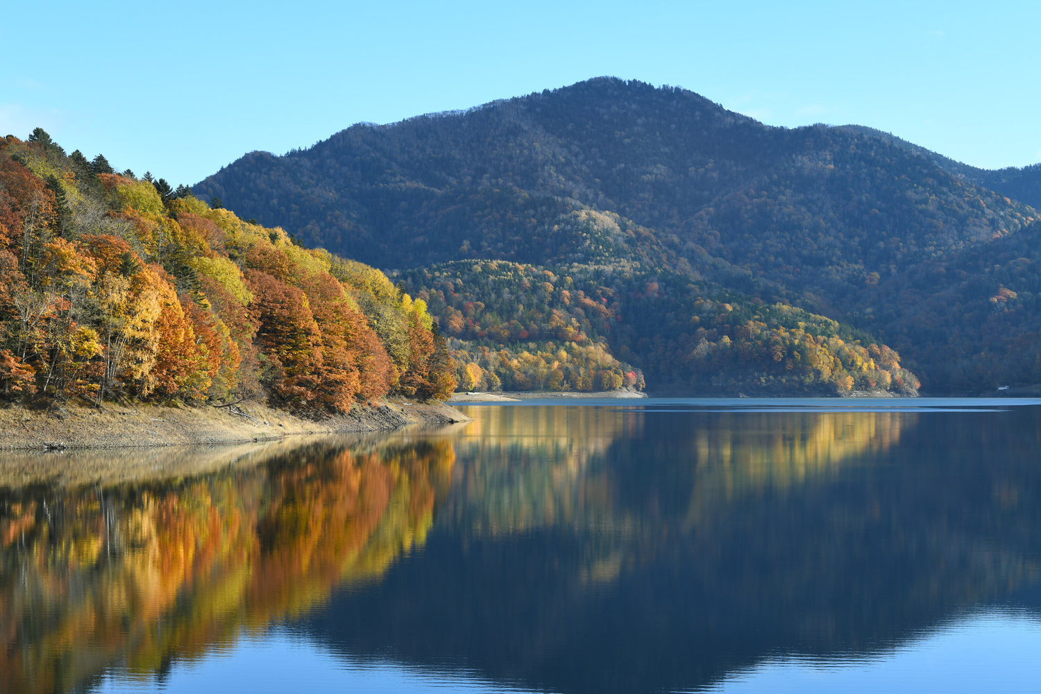 2025年10月21日朝方の風景で、北海道ぬかびら湖の紅葉は例年に比べ遅くなっているようです。