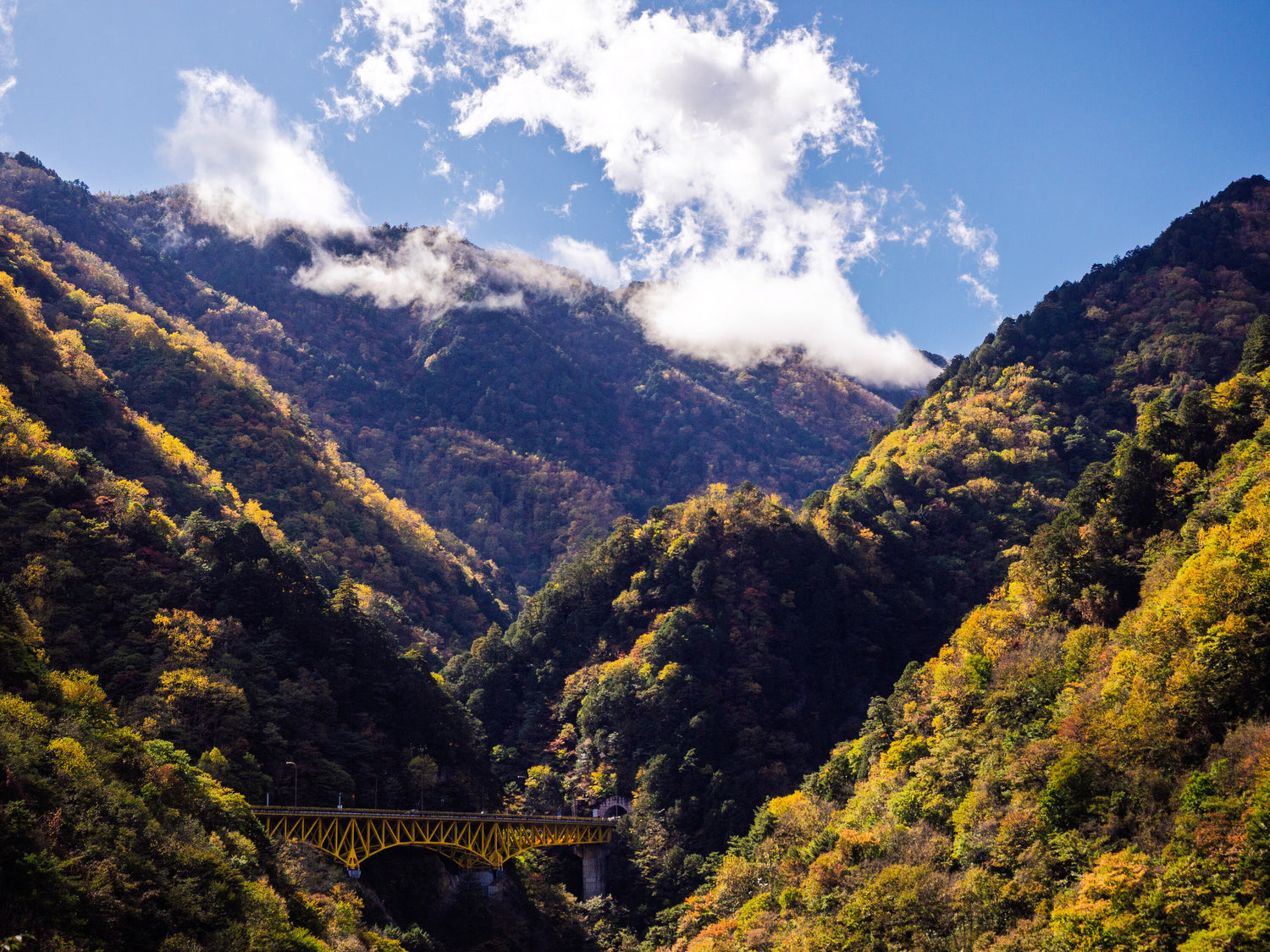 紅葉の進む山間に掛けられた黄金橋
