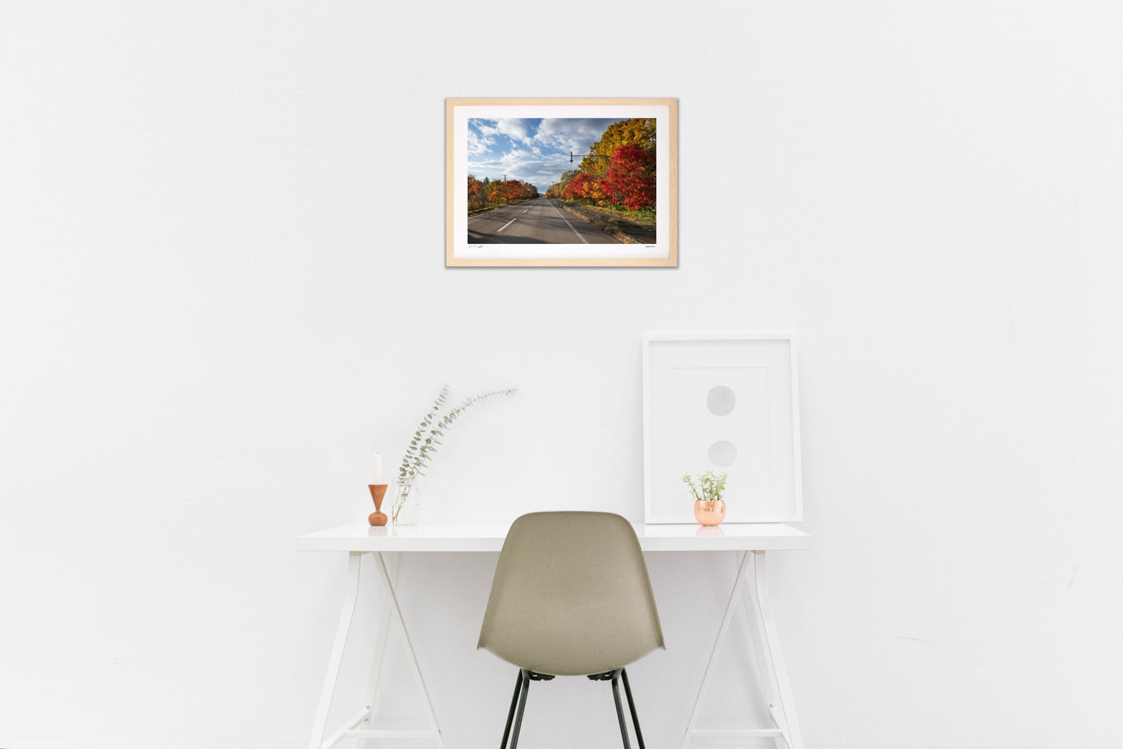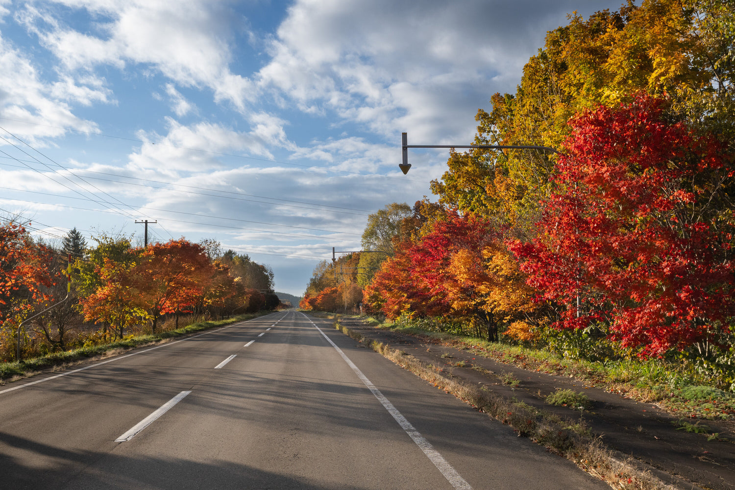真っすぐな道路横にはカラフルな紅葉が並び、目を楽しませてくれます。